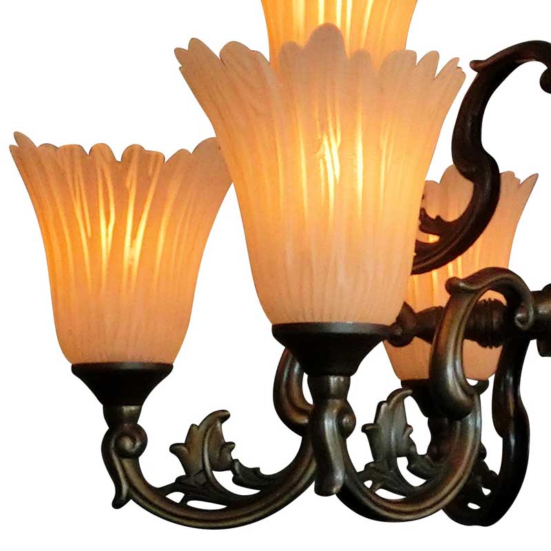 イタリア製のガラスを使用した大型9灯シャンデリア。縦ラインの模様の入ったアンバー色のガラスは点灯時には暖色の柔らかい灯りを演出いたします。ブロンズ塗装のフレームとイタリアガラスを組み合わせたとても雰囲気のあるシリーズです。