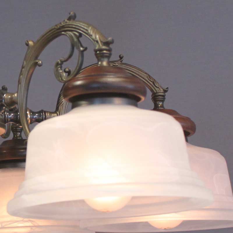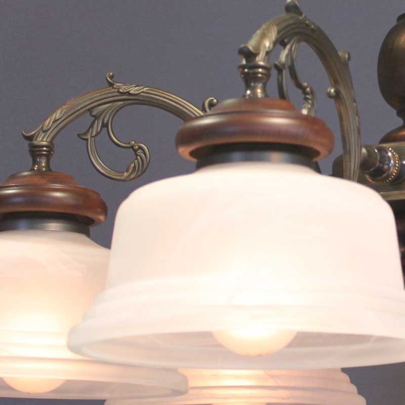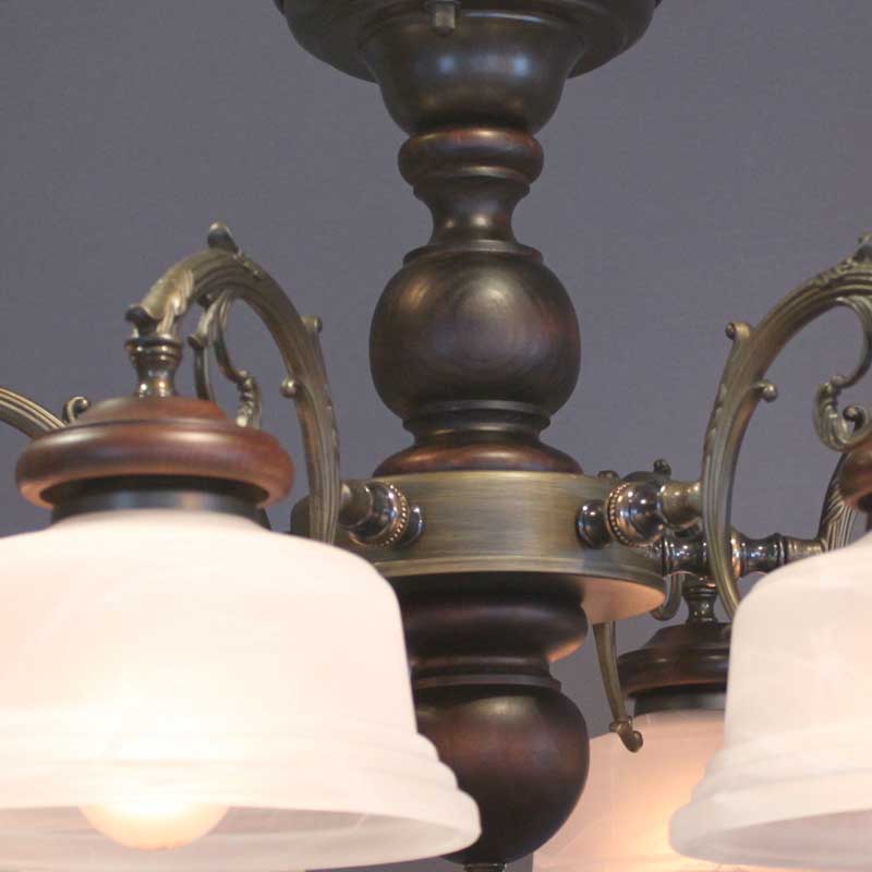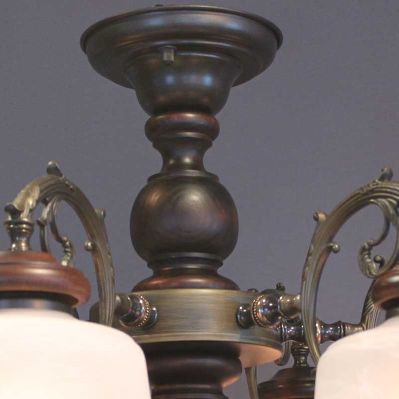 クラシックなレトロ感あるオリジナル直付けタイプのシャンデリアです。アームは金属鋳物を使用し本体と各アームには木飾を使用しております。