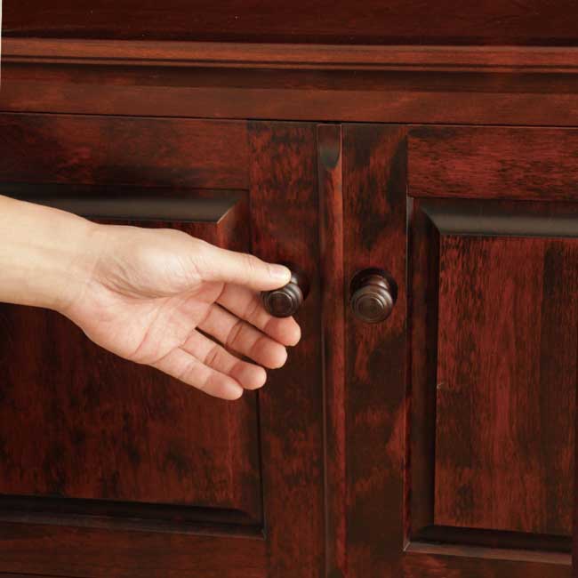 気になる素材は「カバ」。それも北海道産にこだわりました。均等で緻密な木目と質感はまるでシルクのような肌ざわりで、高品質な民芸家具にしっくりと馴染みます。また重硬で丈夫な木質は、開閉を繰り返す食器棚に最適です。塗装は汚れや傷から家具を守る上質なウレタンを使用し、赤みを際立たせる「北海カラー」というオリジナルの色で仕上げました。経年によりツヤはさらに増し、深い飴色に輝きます。