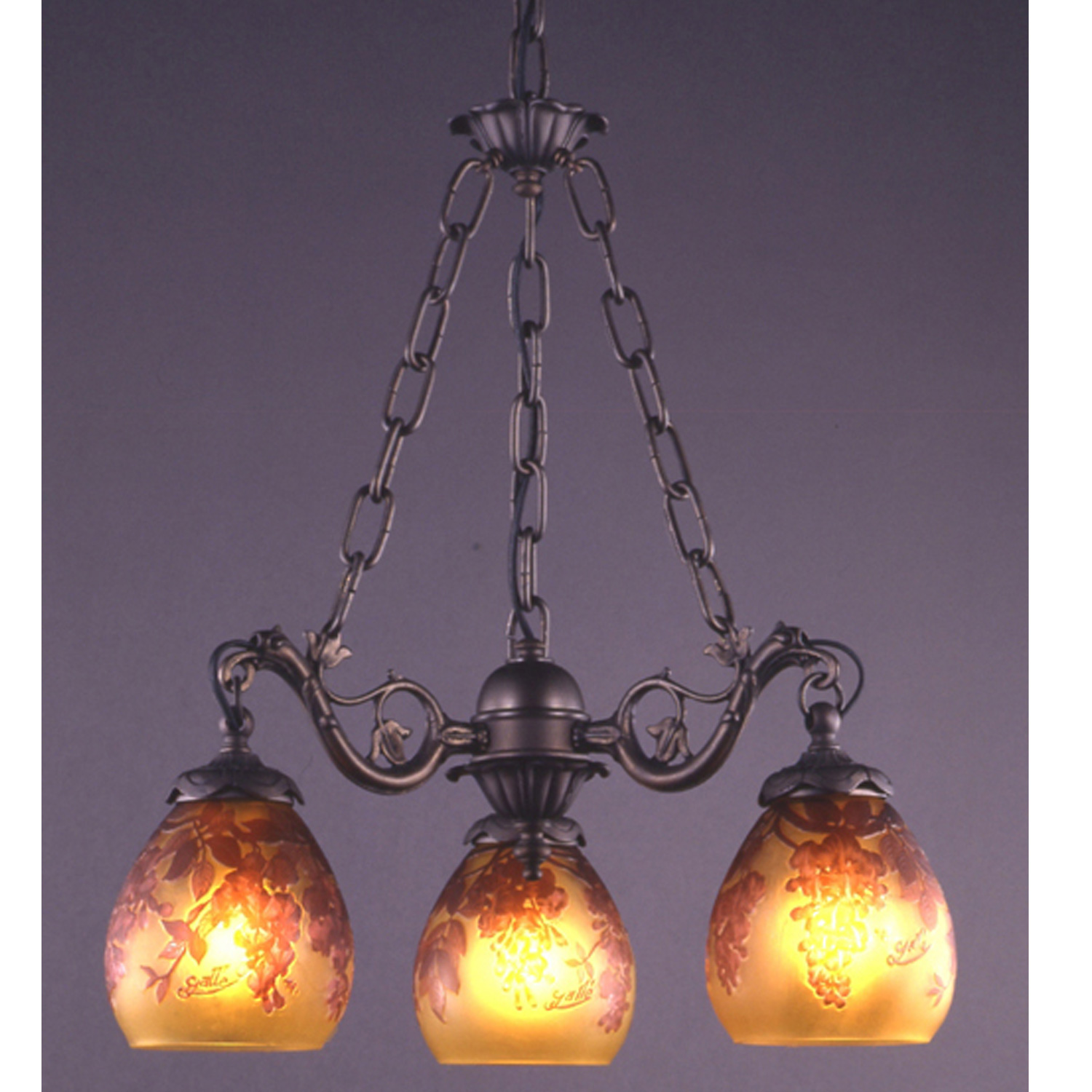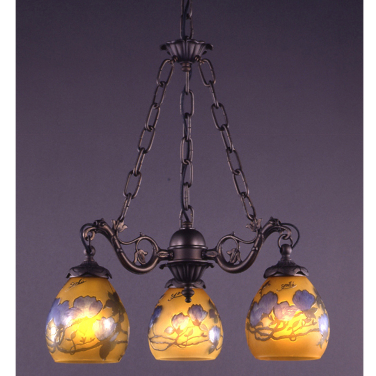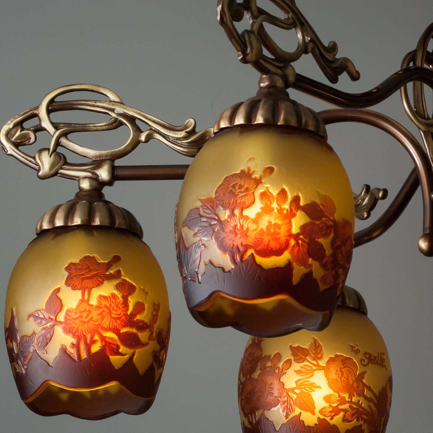 GALLE COLLECTIONのシリーズは、単なるガレランプの模倣ではなく、そのガラスの製法と作風を生かしつつ、これをクラシックスタイルのメタルフレームと組み合わせることで生み出された、全く新しいデザインの照明器具です。