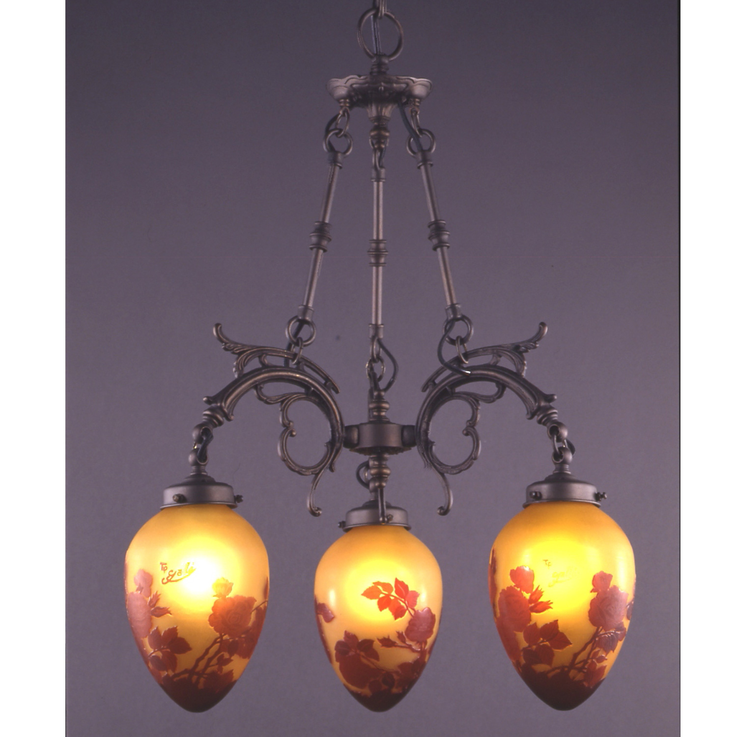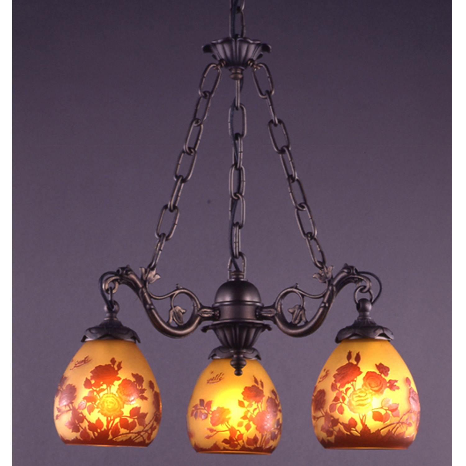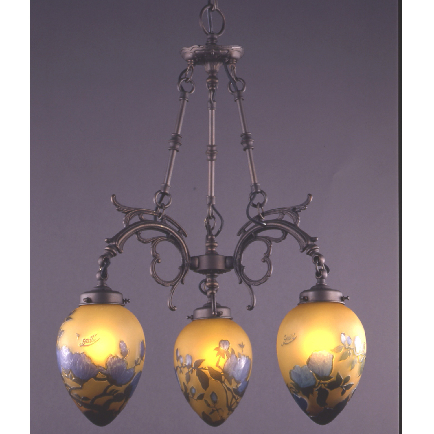 GALLE COLLECTIONのシリーズは、単なるガレランプの模倣ではなく、そのガラスの製法と作風を生かしつつ、これをクラシックスタイルのメタルフレームと組み合わせることで生み出された、全く新しいデザインの照明器具です。
