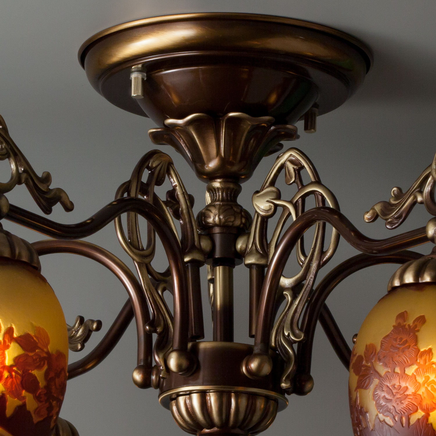 ガレコレクションのレッドローズをモチーフとした直付6灯シャンデリア照明。ガレコレクションは、繊細な色彩と情緒豊かなモチーフ、そして豊かな工芸技術で時代を彩った、エミール・ガレのガラス工芸品を現代に蘇らせたシリーズです。