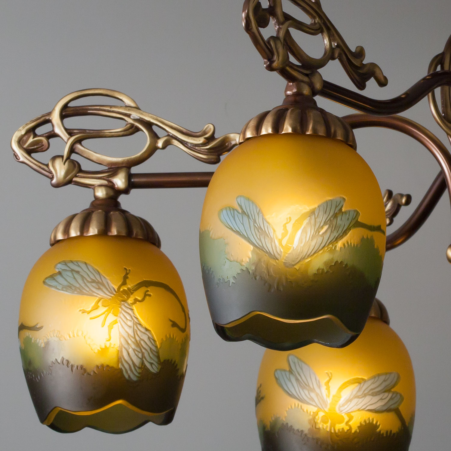 ガレコレクションのトンボをモチーフとした6灯シャンデリア照明。ガレコレクションは、繊細な色彩と情緒豊かなモチーフ、そして豊かな工芸技術で時代を彩った、エミール・ガレのガラス工芸品を現代に蘇らせたシリーズです。ガレコレクション
