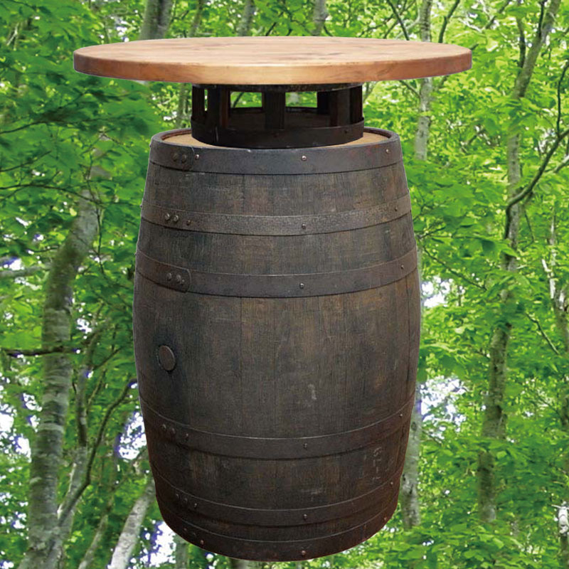 天板とウイスキー樽の固定にウイスキー樽材とタガを使用し制作した風合いのあるウッドステーを使用しています。