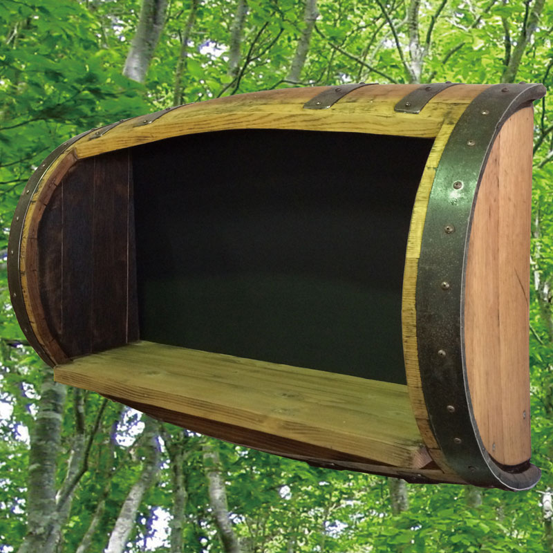 (北海道、九州、沖縄、離島等一部地域を除く) バレルブラックボードオープンラック(ナチュラル色)は、使い込まれたウイスキー樽を半分に割り、棚を付けた造られた味わい深い飾り棚です。