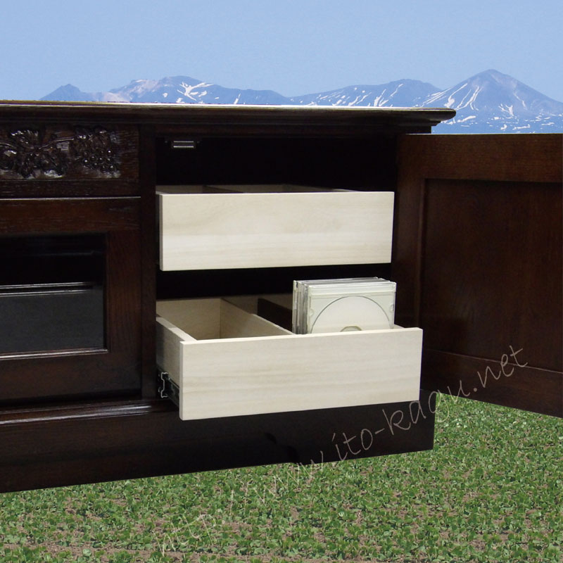 北の大地のこだわりの国産クラシック家具シリーズ「バッカス」の間口160cm幅のテレビボードです。とても深みのある色合いで、高級感漂う製品に仕上がりました。