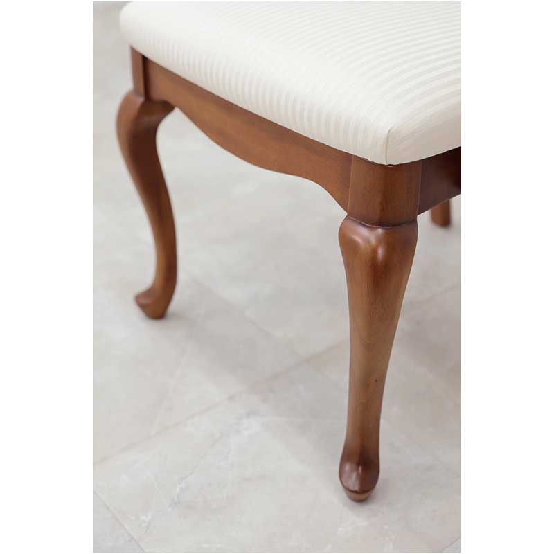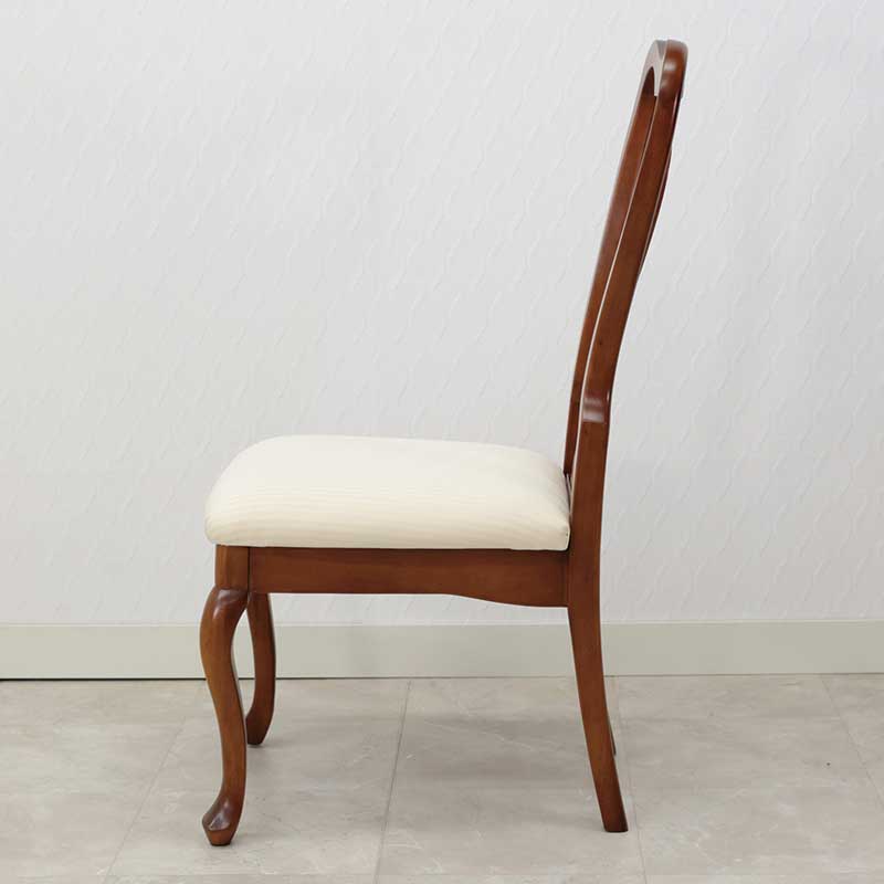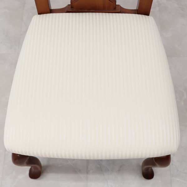 座面はアイボリーの細いストライプ柄のファブリックを張った、クィーンアン様式のエレガントなダイニングチェアです。