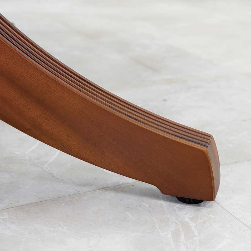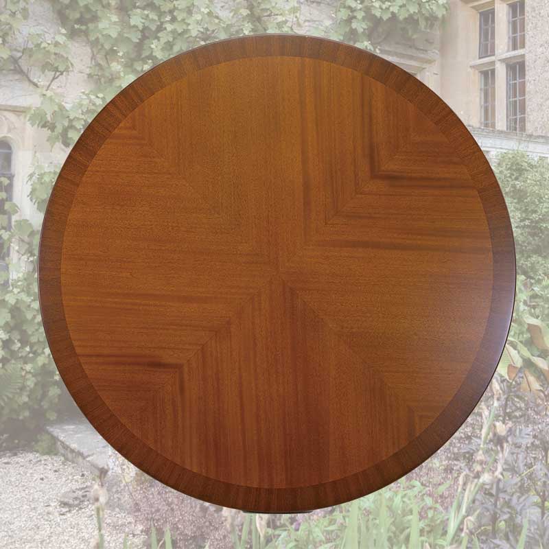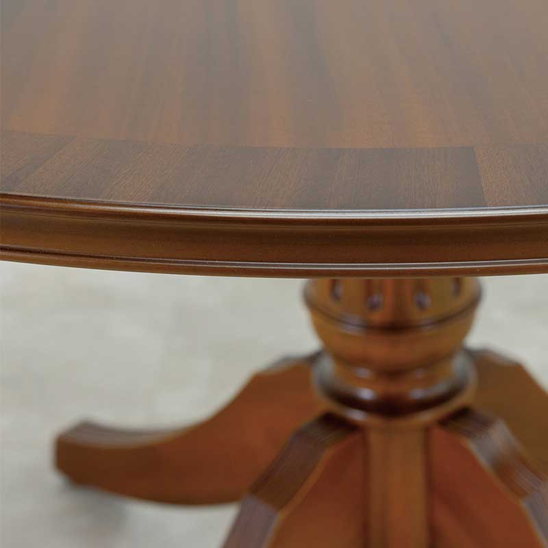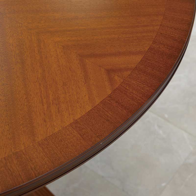 ミディアムブラウンの明るく上品な仕上げのブライトン・シリーズに、英国の格調高い「リージェンシースタイル」のアイテムが加わりました。天板はマホガニー柾目突板の逆ダイヤモンド貼りに、周囲にサペリ柾目突板の模様貼りを施した支柱タイプの丸テーブルです。