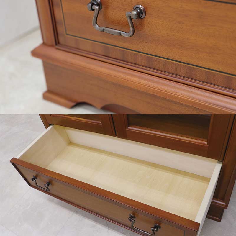 引出し前板表面にマホガニー材柾目の突板にサペリ材柾目の突板で 模様貼りを施し、ミディアムブラウンの明るく上品な色合いとフォルムが魅力のクラシカルデザインです。