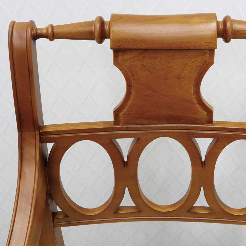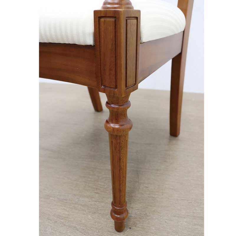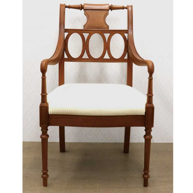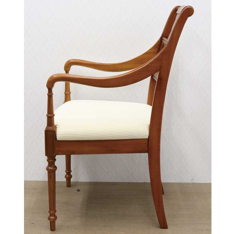 〔前脚オープン部〕幅440×奥330×高305mm (最小寸法) 〔後脚オープン部〕幅340×奥330×高305mm (最小寸法) 〔座面サイズ〕 幅530×奥440×厚70mm 〔張地・設定色数〕 New Laura color 140 〔組成〕ポリエステル46% コットン54% 〔中身〕ウレタンフォーム Sバネ+ウェービングテープ 〔笠木裏〕浅めの掘り込み手掛けがあります英国リージェンシースタイルのアームチェア 逆輸入家具