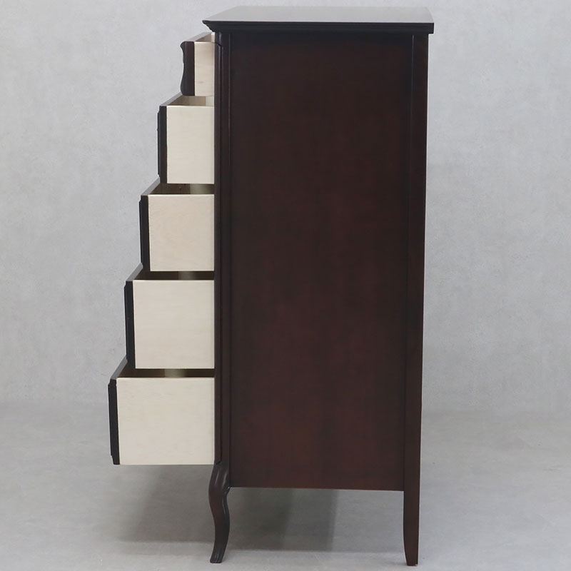 日本の優良メーカーの輸出向け海外工場製ですので、内装なども日本の高い基準を満たした優良品です。クラシック様式のミラーナD色の80cm幅5段チェスト 逆輸入家具