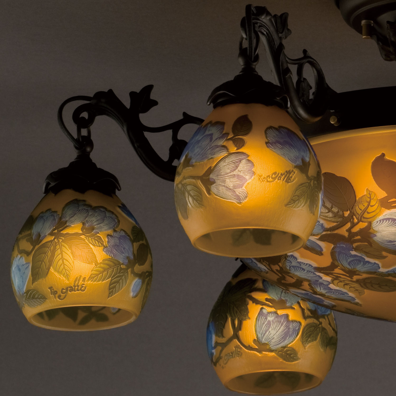 ガレコレクションの木蓮をモチーフにした超豪華な10灯シャンデリア照明AKN-AGL-1423DB-3242。ガレコレクションは、繊細な色彩と情緒豊かなモチーフ、そして豊かな工芸技術で時代を彩った、エミール・ガレのガラス工芸品を現代に蘇らせたシリーズです。