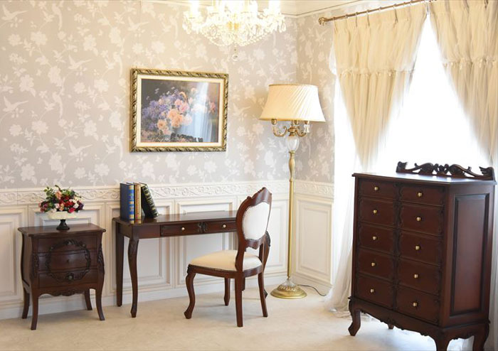 インドネシアの高級木材、マホガニーの無垢材を使用した、ヨーロピアンアンティーク調家具です。