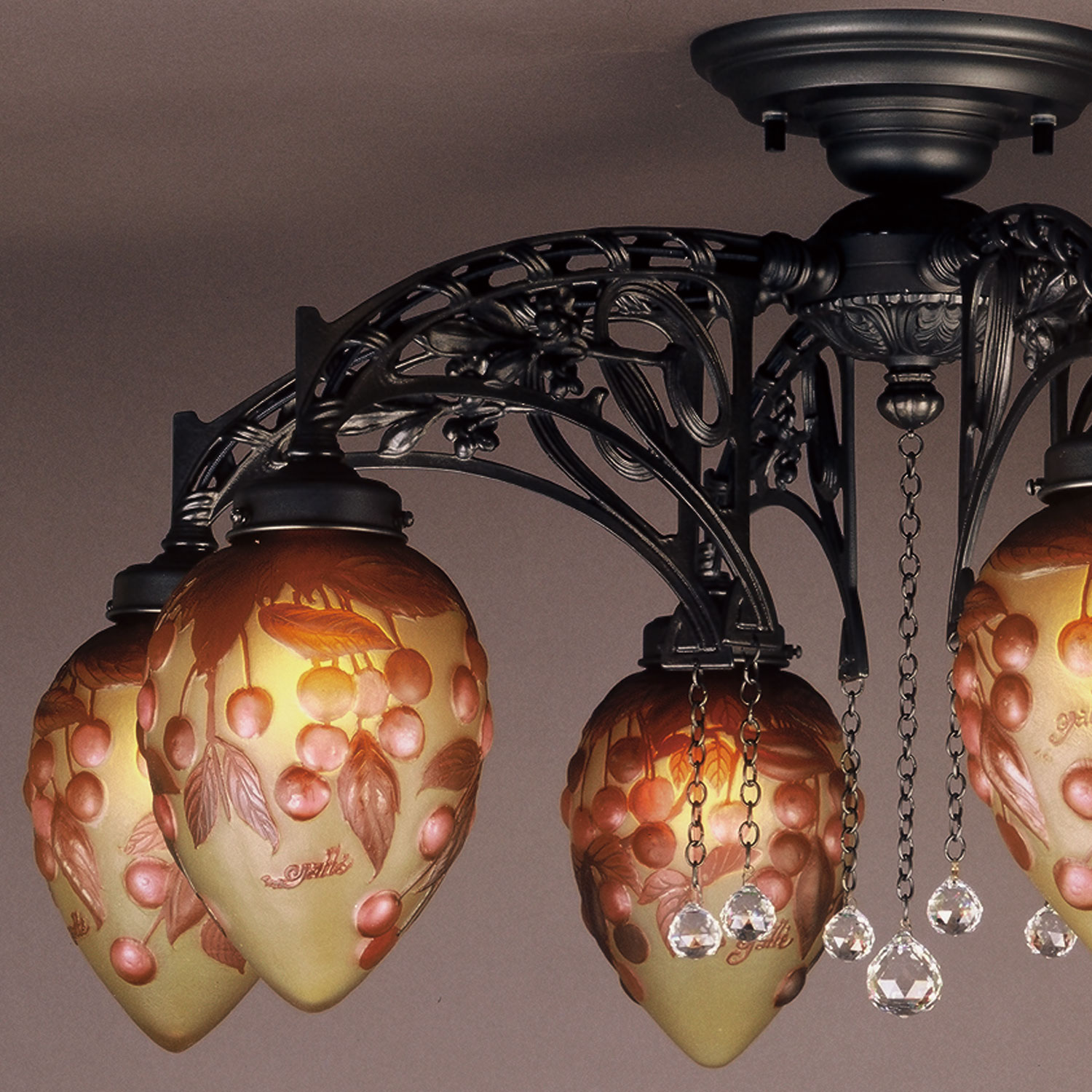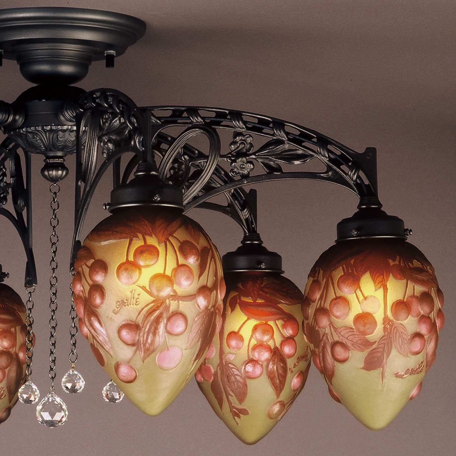 レッドチェリーの6灯ガレ風シャンデリア照明AKN-AGL-2175DB-6CH。ガレコレクションは、繊細な色彩と情緒豊かなモチーフ、そして豊かな工芸技術で時代を彩った、エミール・ガレのガラス工芸品を現代に蘇らせたシャンデリア照明のシリーズです。ガレコレクション