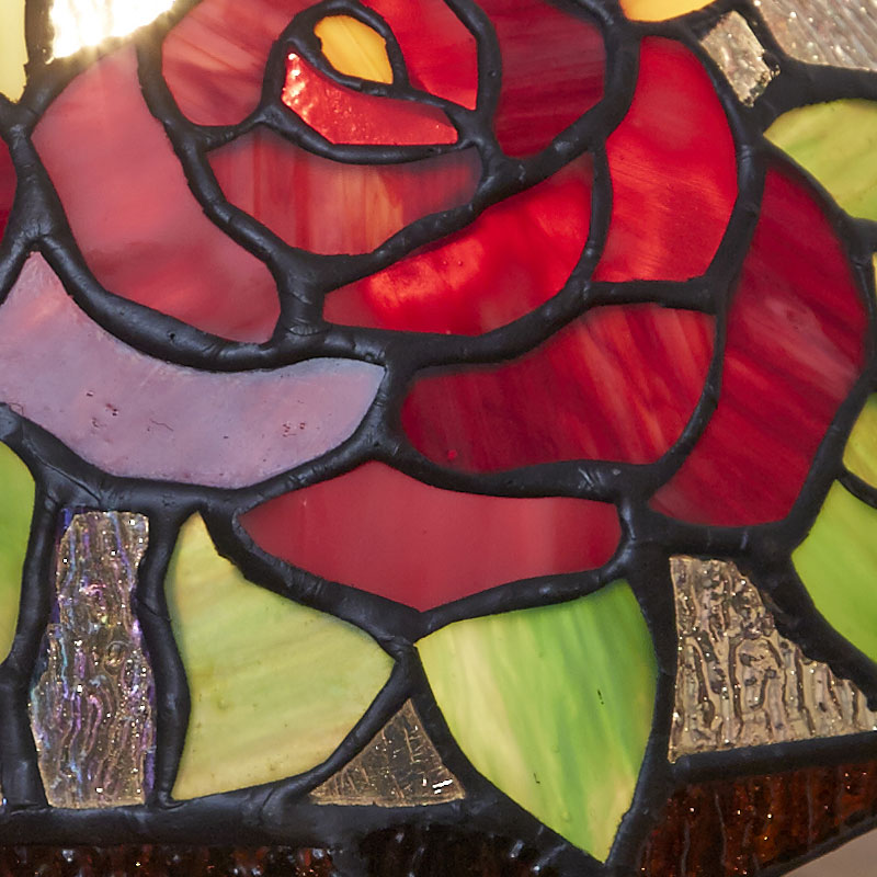 大輪の赤い薔薇には2種類のガラスを使いよりリアルさを表現しています。