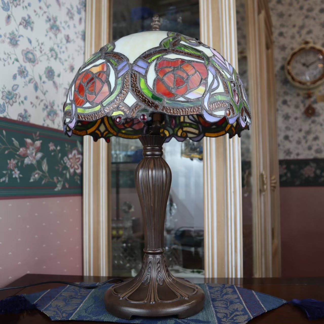 バラをモチーフに様々な色ガラスを使用したおしゃれなステンドグラステーブルランプ。