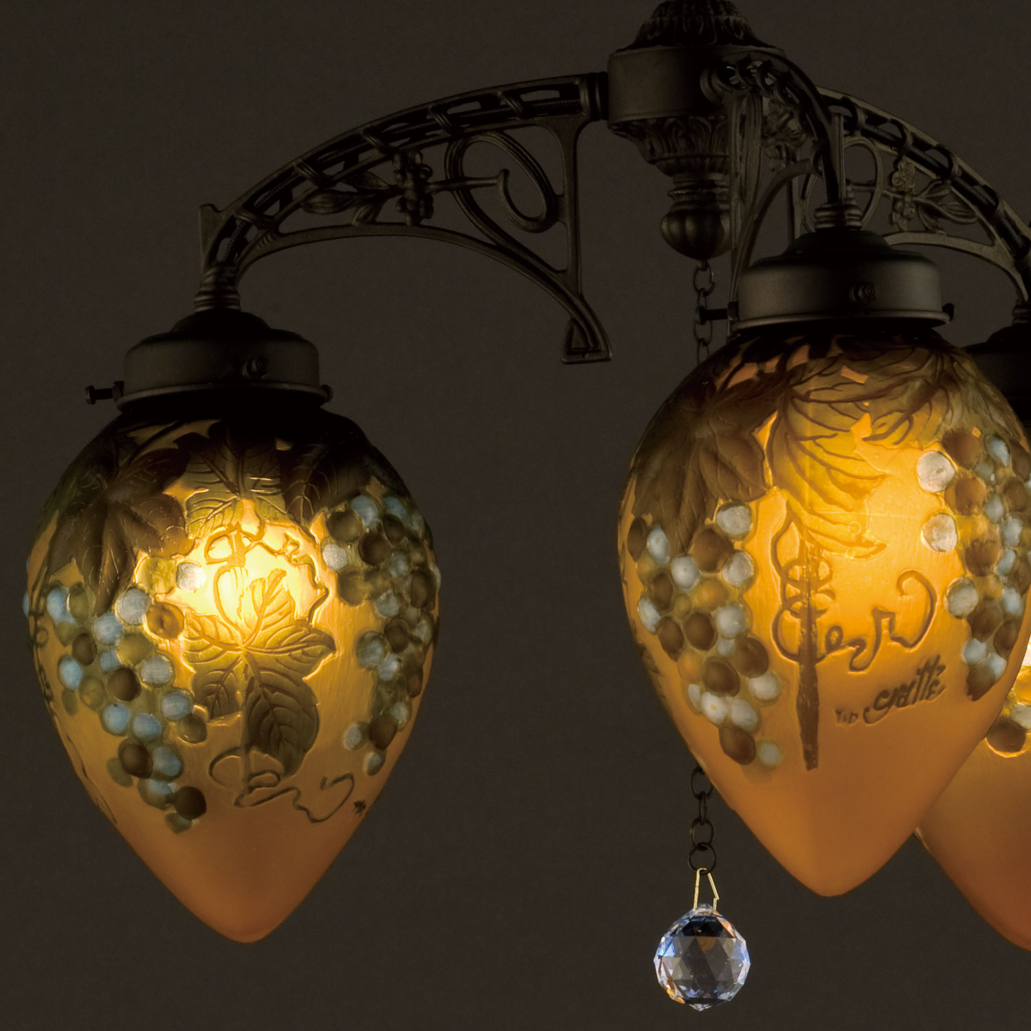 GALLE COLLECTIONのシリーズは、単なるガレランプの模倣ではなく、そのガラスの製法と作風を生かしつつ、これをクラシックスタイルのメタルフレームと組み合わせることで生み出された、全く新しいデザインの照明器具です。