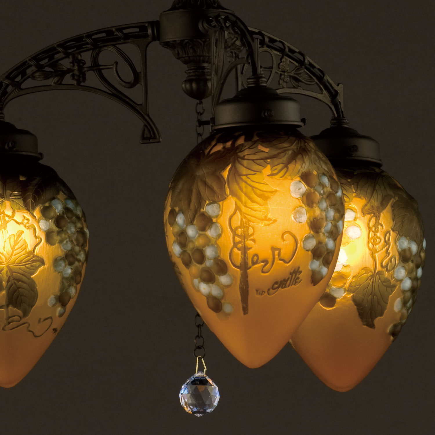 ガレコレクションのブルーグレープをモチーフにした3灯シャンデリア照明AKN-AGL-2176DB-3GR。ガレコレクションは、繊細な色彩と情緒豊かなモチーフ、そして豊かな工芸技術で時代を彩った、エミール・ガレのガラス工芸品を現代に蘇らせたシリーズです。