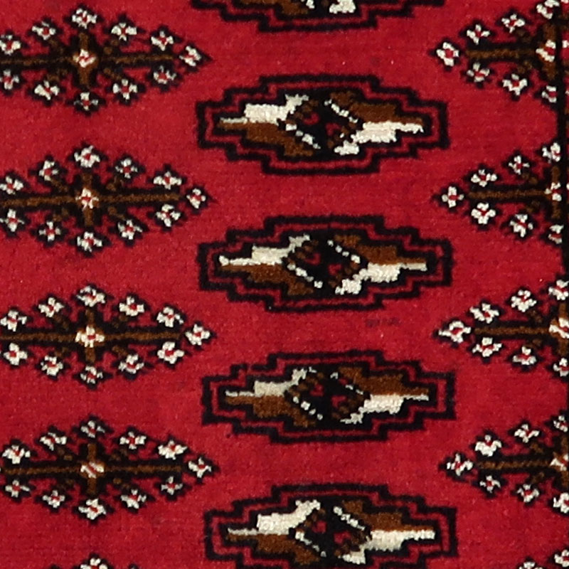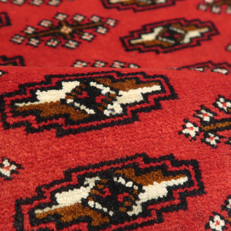 ペルシャ絨毯トルクメンは、遊牧民の自然とのかかわりが象徴的に表され、幾何学的なモチーフが用いられています。赤が基本色でブルー、グリーンなどの糸が使われてますが、こちらの絨毯は、トルクメンの基本的なデザインの絨毯です。