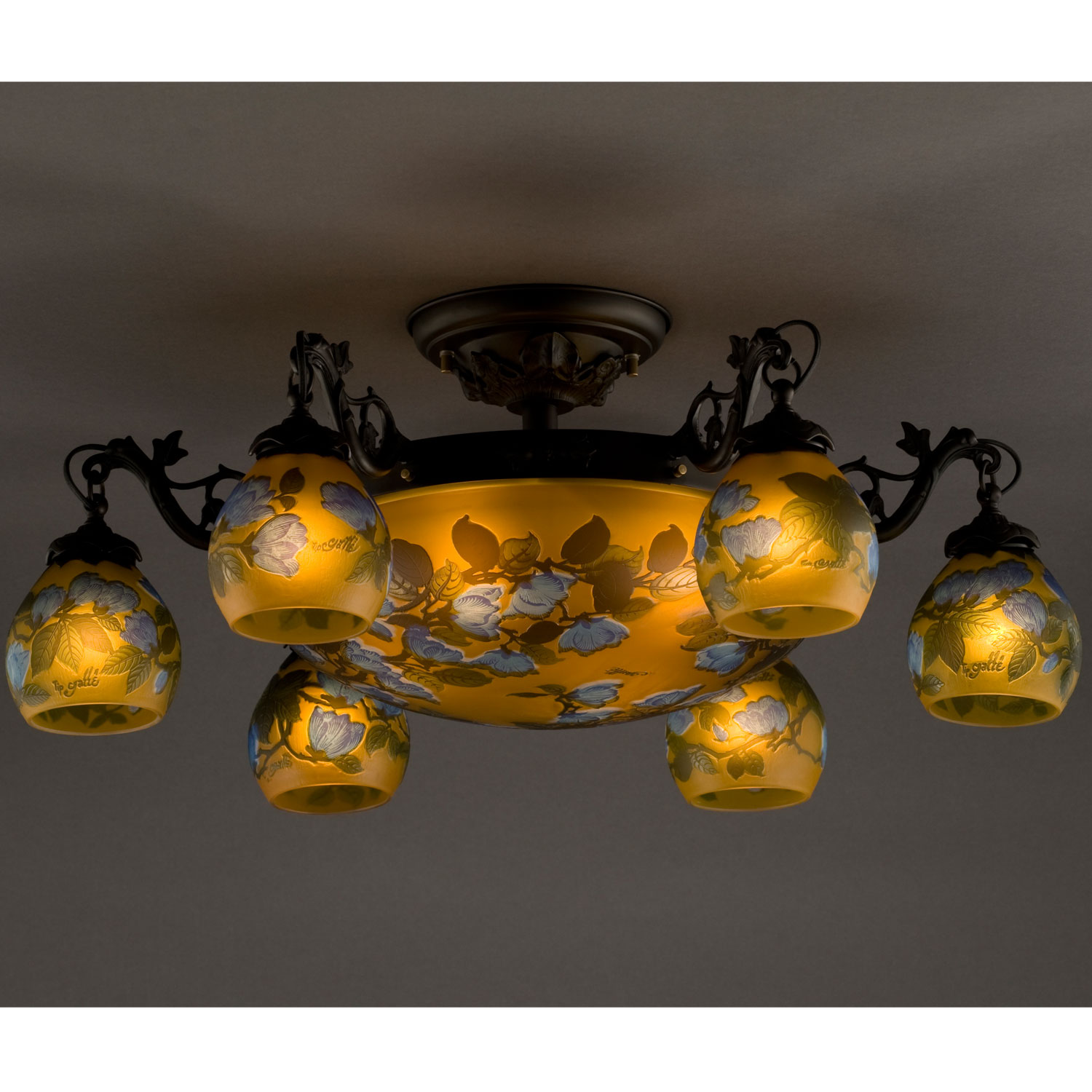 GALLE COLLECTIONのシリーズは、単なるガレランプの模倣ではなく、そのガラスの製法と作風を生かしつつ、これをクラシックスタイルのメタルフレームと組み合わせることで生み出された、全く新しいデザインの照明器具です。
