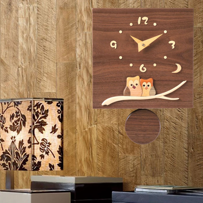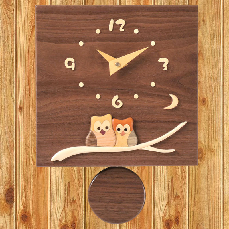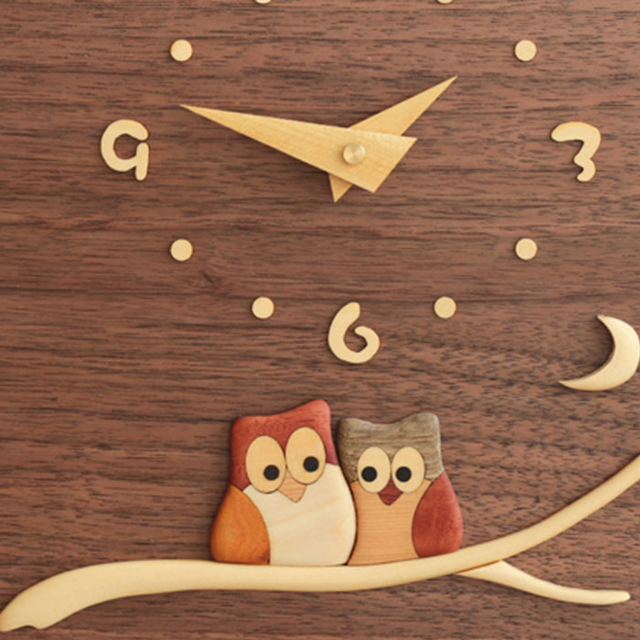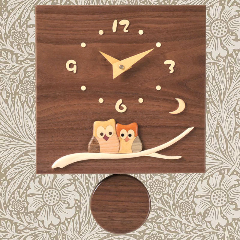 (沖縄、離島等一部地域を除く) ウォールナットの美しい木目の板に、多彩な木の色で描いた、可愛いふくろうの時計。お部屋を柔らかな雰囲気で彩り、優しく時を告げます。また、温もりを感じさせるインテリアとしてもご愛用いただけます。