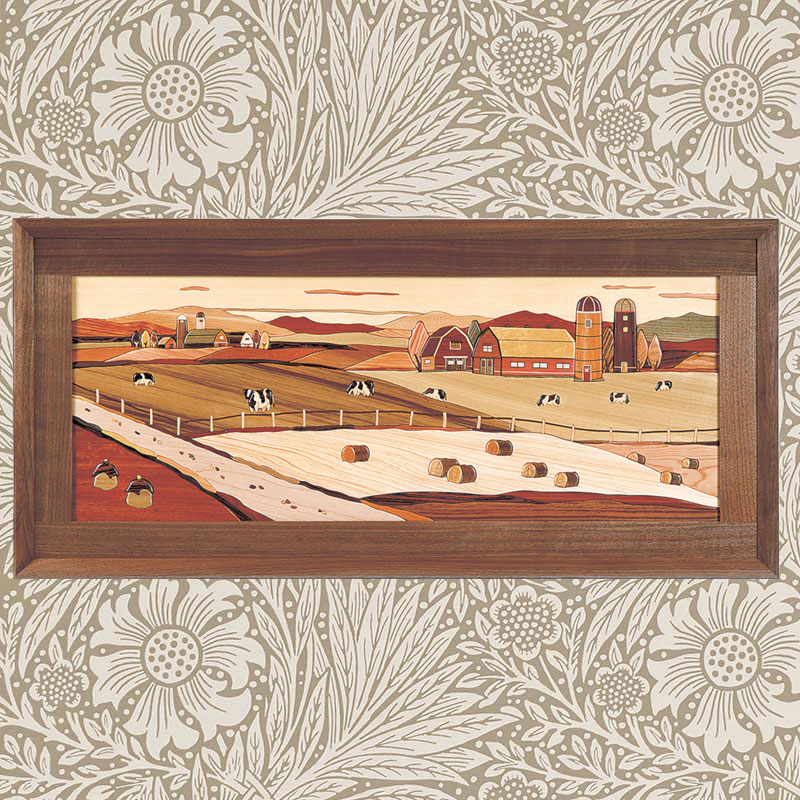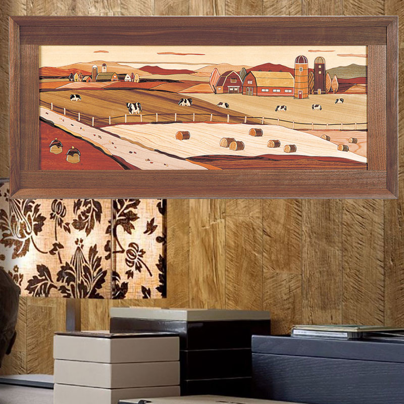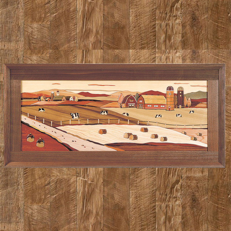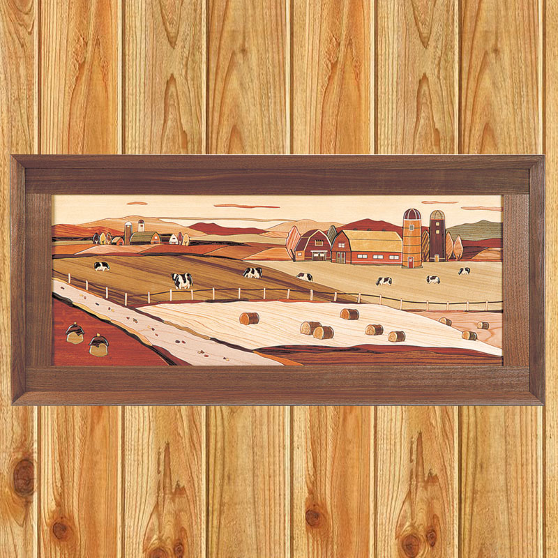 寄せ木絵のラインナップ中、最も迫力あるサイズの寄せ木絵。広々とした大地、レトロさを醸し出すサイロ、のんびりと草を食む乳牛など、”古き良き北海道”をリアルに描き出しました。