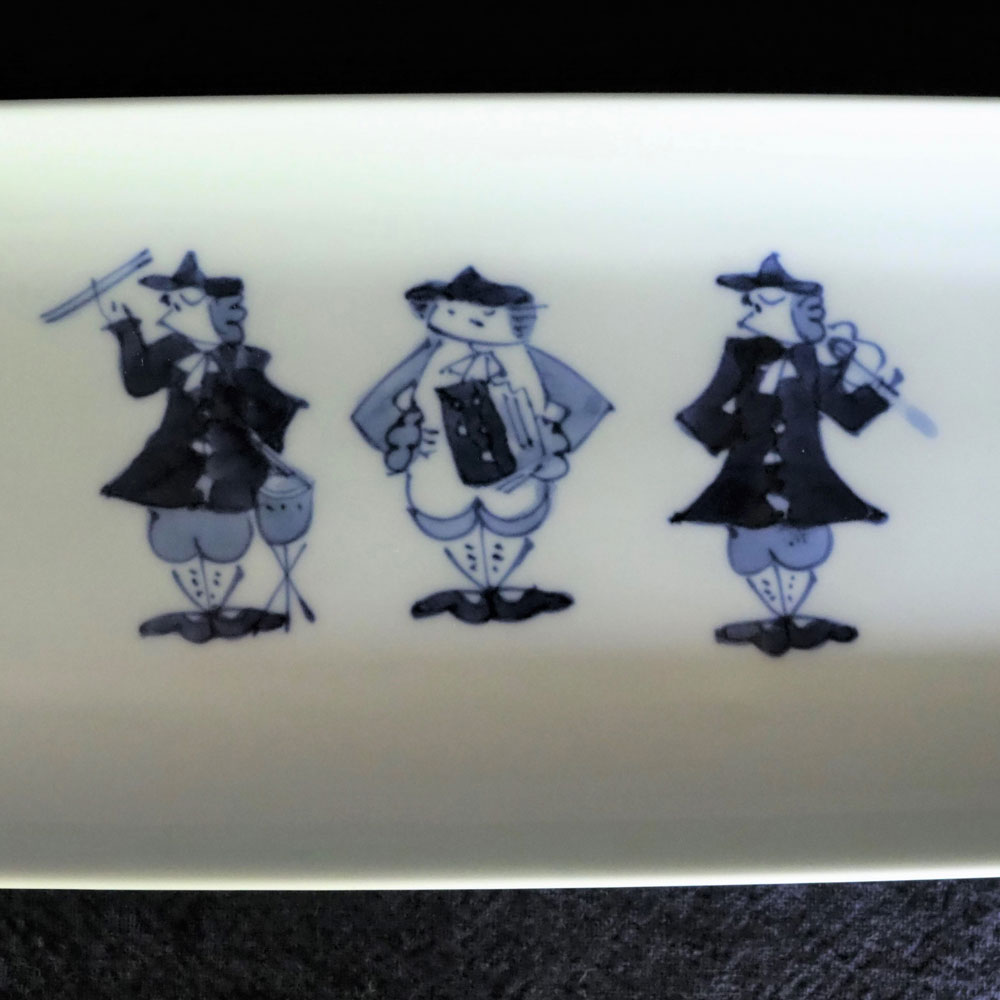 青花の代表的な絵柄の異人さんが楽器を手にしたデザインは、斬新で楽しいそうな雰囲気です。