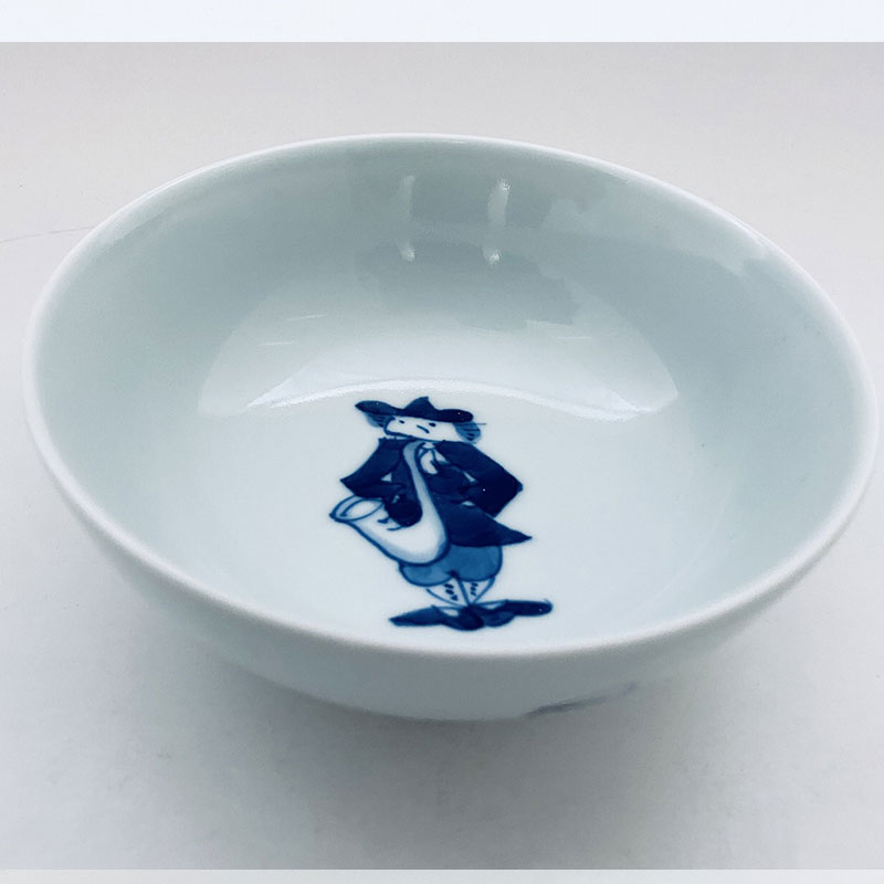 磁器のぬくもりとその絵付けの温かみが、食事の楽しさを演出してくれる有田焼ハーモニー・シリース゛ サックス4寸ボール。青花の代表的な絵柄の異人さんが楽器を手にしたデザインは、斬新で楽しいそうな雰囲気です。