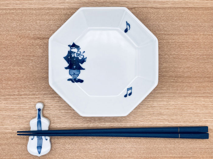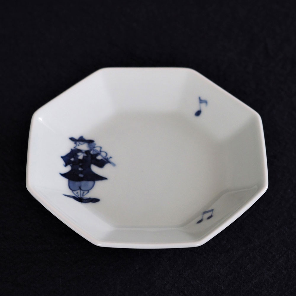 磁器のぬくもりとその絵付けの温かみが、食事の楽しさを演出してくれる有田焼ミューシ゛ック・シリース゛ 正八角銘々皿 バイオリン。青花の代表的な絵柄の異人さんが楽器を手にしたデザインは、斬新で楽しいそうな雰囲気です。