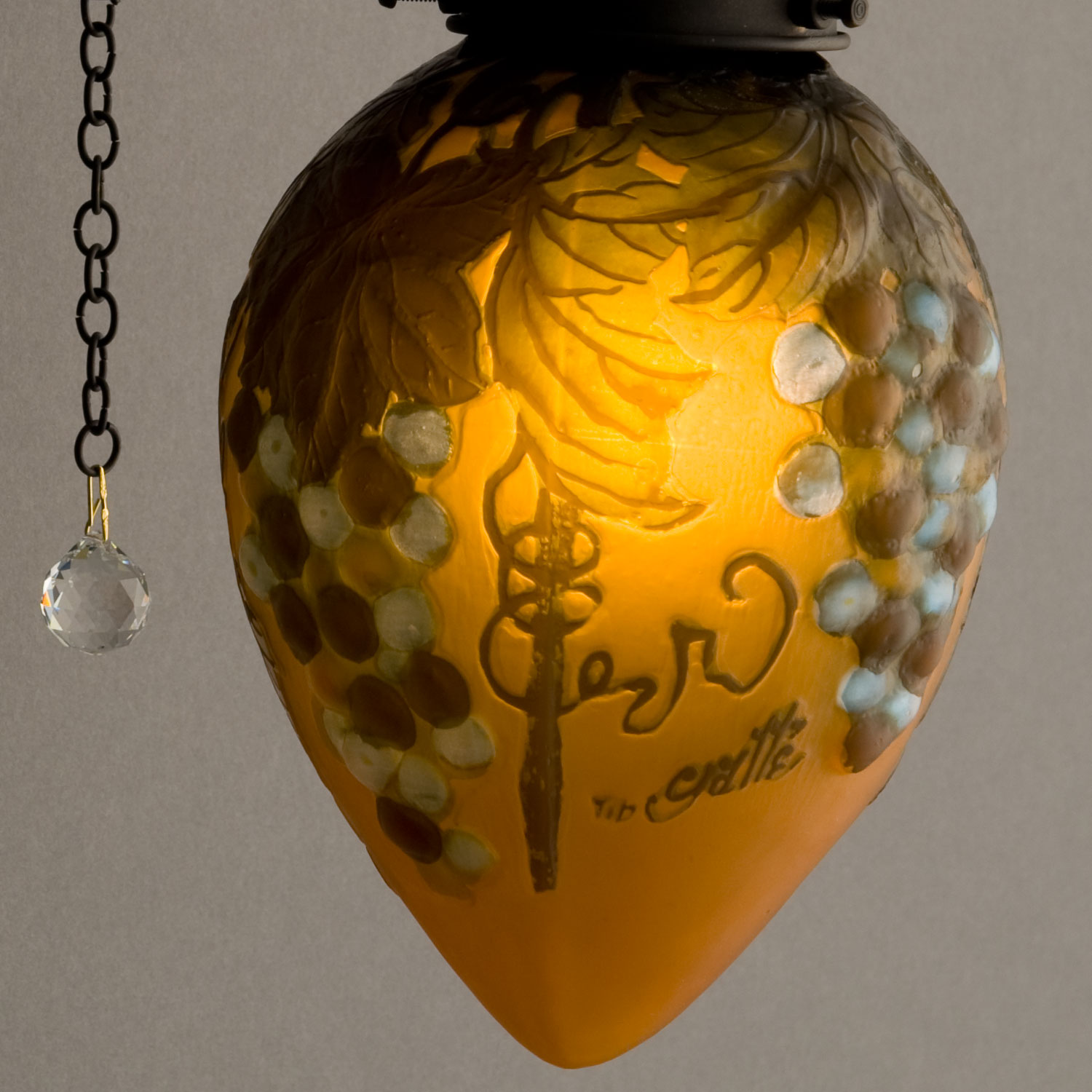 GALLE COLLECTIONのシリーズは、単なるガレランプの模倣ではなく、そのガラスの製法と作風を生かしつつ、これをクラシックスタイルのメタルフレームと組み合わせることで生み出された、全く新しいデザインの照明器具です。