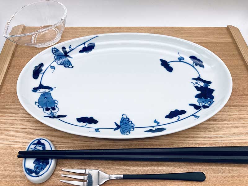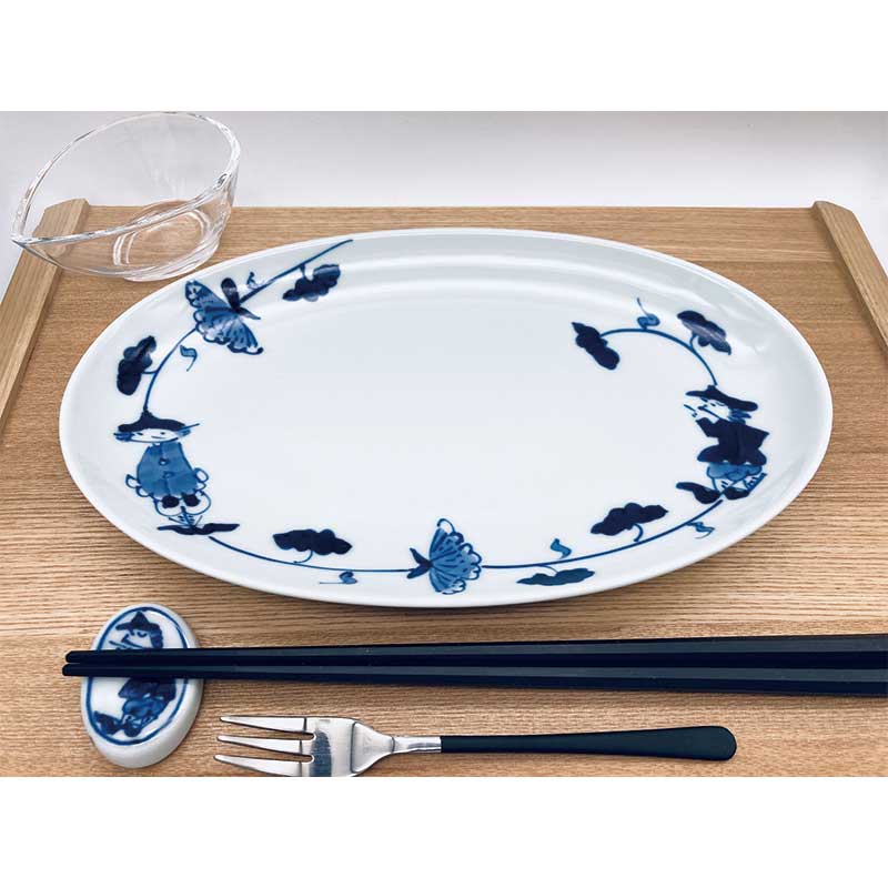 牡丹唐草異人小判幅広焼皿 青花 有田焼