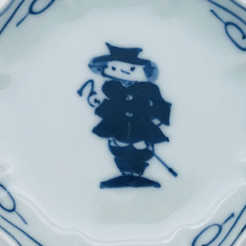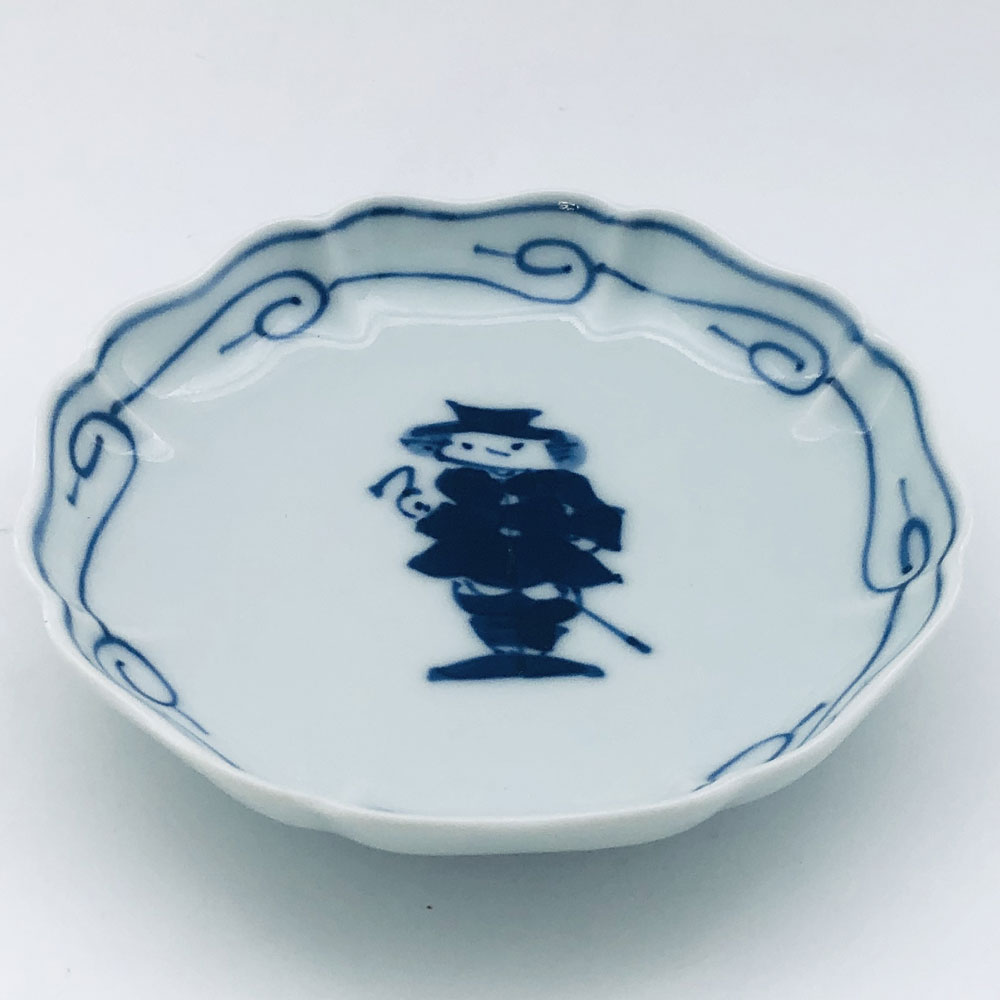 渕が少し立ち上がっているのでつかみやすく、重ねやすい小皿です。絵柄は、ステッキを持ったかわいらしい異人さんです。