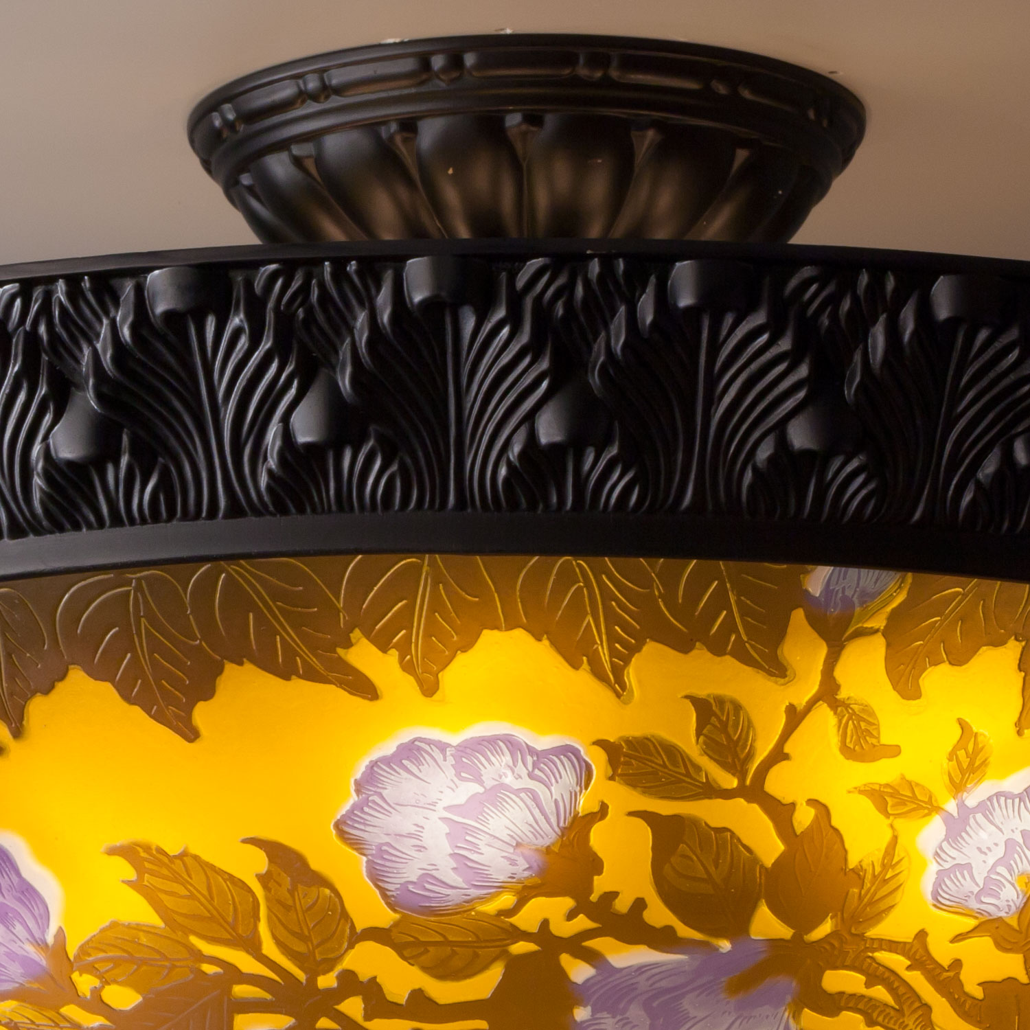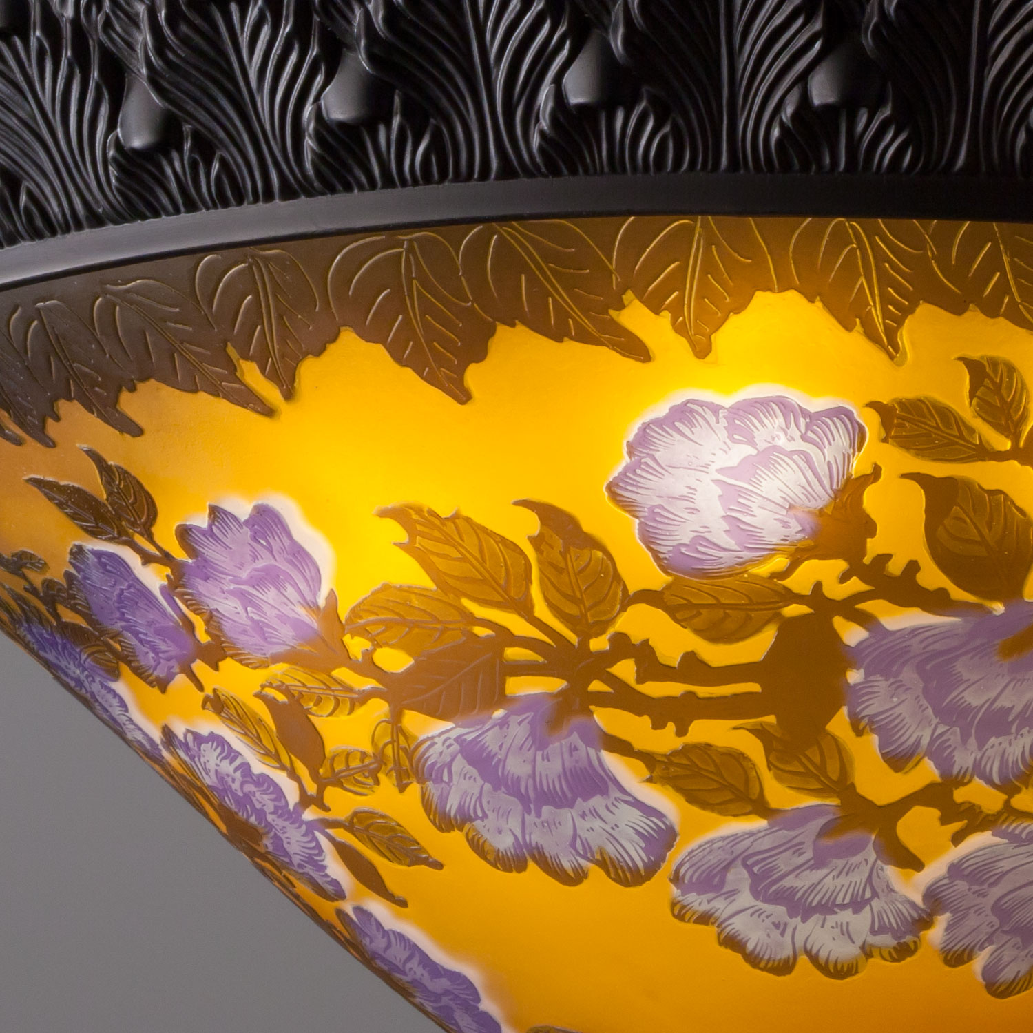 この「酸でガラスを腐食させる」手法は、現代ではより一般的に用いられている「サンドブラスト(文様をマスキングしたうえで金剛砂を吹き付けてガラスを削る方法)」に比べて、はるかに時間と手間がががる製法ですが、これが本来のガレの手法であり、これでしか出せないナチュラルな仕上がりが得られます。