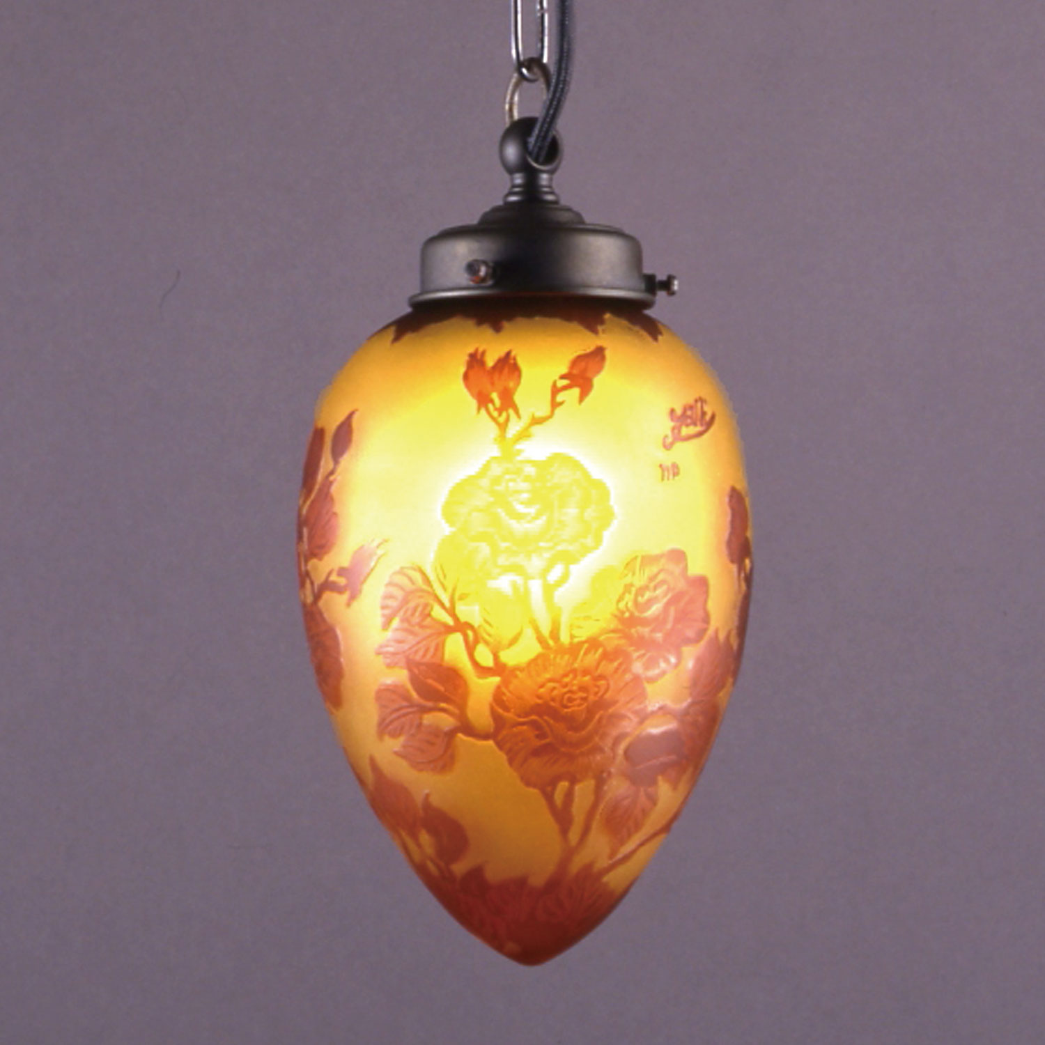 GALLE COLLECTIONのシリーズは、単なるガレランプの模倣ではなく、そのガラスの製法と作風を生かしつつ、これをクラシックスタイルのメタルフレームと組み合わせることで生み出された、全く新しいデザインの照明器具です。