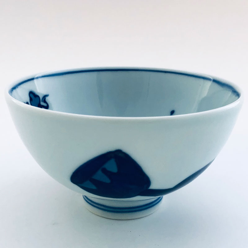 染付の濃い青と白は、白いごはんも、炊き込みご飯もおいしく引き立て、 手のひらにすっぽり収まるカタチでごはんのぬくもりを伝えます。