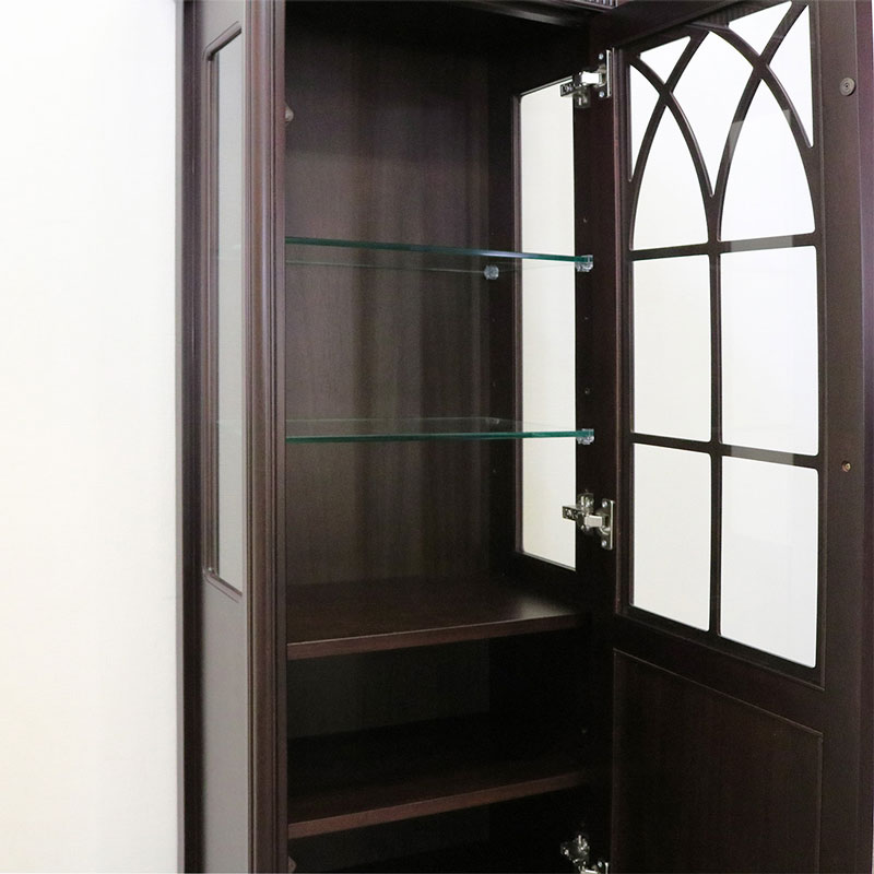 〔扉内内寸〕(中央1段目)幅466×奥311×高130mm 〔中央扉ガラス〕厚3mm 〔背面〕 •扉内奥上部に配線用穴加工有り •裏板取り外し可能 〔扉内内寸〕(左右)幅289×奥311×高580mm 〔可動棚板〕(左右)木製棚板 各2枚 幅292×奥290×厚18mm 〔棚板ピッチ数〕 地板から近い順地板より131mmから64mmピッチ(6段可動) 〔引出し内寸〕 •(中央2段目)幅433×奥299×高78mm ゴムストッパー付 •(中央3~4段目)幅433×奥299×高125mm 3段引きスライドレール付 〔脚下オープン部〕 幅1090×奥327×高130mm 〔天板〕 •模様張り仕様 中央後方に欠き込みあり 幅80×高10mm ※写真と商品は色合いが多少異なる場合がございます。予めご了承ください。 ※天板耐荷重は目安です。保証値ではありません。猫脚の55cm幅キュリオ ケントハウス 逆輸入家具
