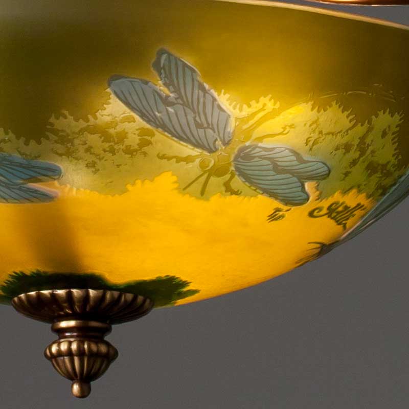 ガレコレクションのトンボをモチーフとしたチェーン吊り3灯ペンダント照明。ガレコレクションは、繊細な色彩と情緒豊かなモチーフ、そして豊かな工芸技術で時代を彩った、エミール・ガレのガラス工芸品を現代に蘇らせたシリーズです。