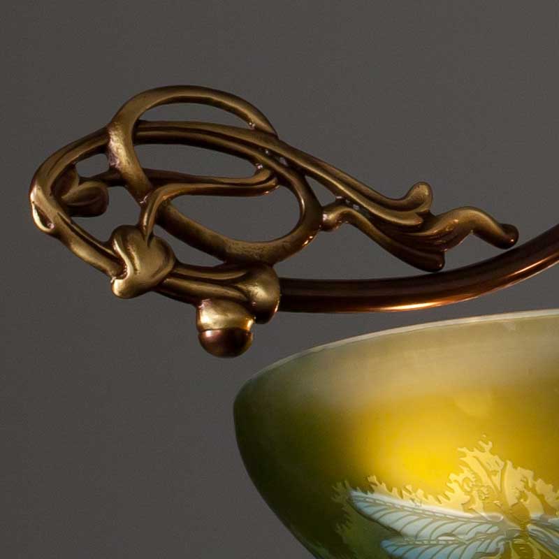 花の様式と謳われたヨーロッパ19世紀末-アールヌーボー。 エミール・ガレ(1846-1904)は、この時代を代表するガラス工芸作家として位置づけられています。 1846年フランス・ロレーヌ地方のナンシーに生まれたガレは、幼少の頃より詩、文学、哲学、鉱物学、植物学に深い関心を持ち、また一方では建築学や装飾美術を身につけていきました。 1867年からは父の経営するガラス工場でデザイナーとして働く傍ら、ガラス製品の基礎から様々な実践的技法を習得していきました。こうして後のガレ作品の素地となる広範な教養、独創的なデザインを実現する技術と知識が構築されていったのです。 1877年工場の経営を父から引き継いだガレは、それまでに身につけた広範な教養とガラス製作技術を背景に、それ以前のガラス工芸とは全く異なる、斬新な作品を次々に生み出してきました。 1889年と1900年のパリ万博への出品作品はグランプリを受賞し、ここにガレはアールヌーボー芸術の頂点を極めました。総真鍮製メタルフレーム