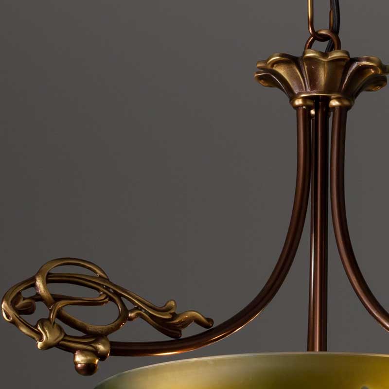 GALLE COLLECTIONのシリーズは、単なるガレランプの模倣ではなく、そのガラスの製法と作風を生かしつつ、これをクラシックスタイルのメタルフレームと組み合わせることで生み出された、全く新しいデザインの照明器具です。