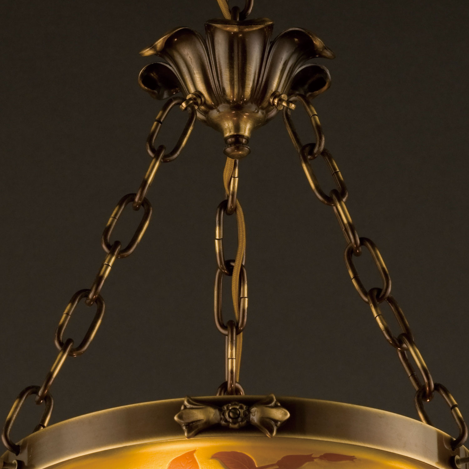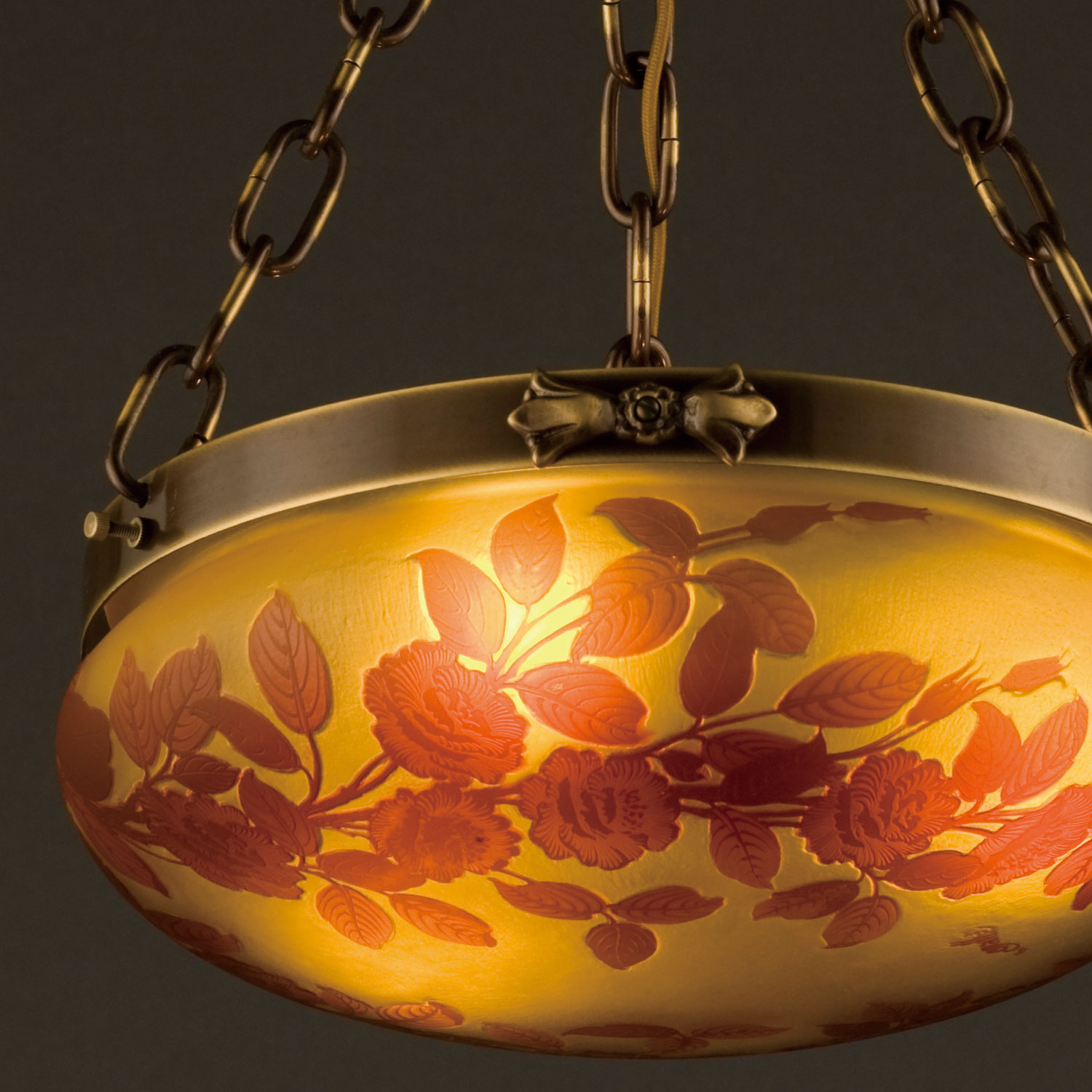 ガレコレクションの薔薇をモチーフとした3灯ペンダント照明AKN-AGL-0221AB-51。ガレコレクションは、繊細な色彩と情緒豊かなモチーフ、そして豊かな工芸技術で時代を彩った、エミール・ガレのガラス工芸品を現代に蘇らせたシリーズです。