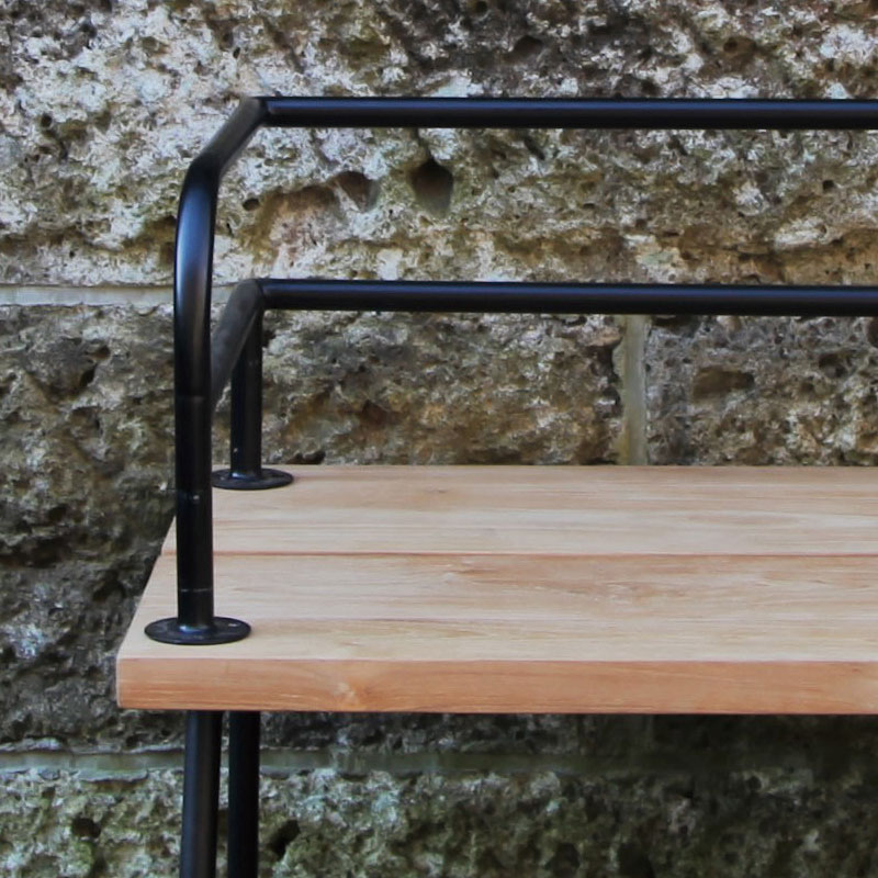シンプルなデザインのアイアンフレームベンチは、チーク材無垢とアイアンのコンビネーション。
