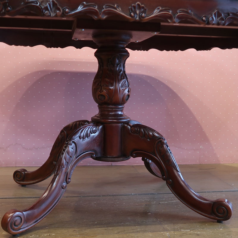 シャルルロワシリーズのおしゃれな楕円型150cm幅ダイニングテーブル。テーブルの幕板の手彫りの彫刻も熟練の職人が丁寧に作っています。さらに流れるようななめらかな曲線が、高級感を醸し出します。