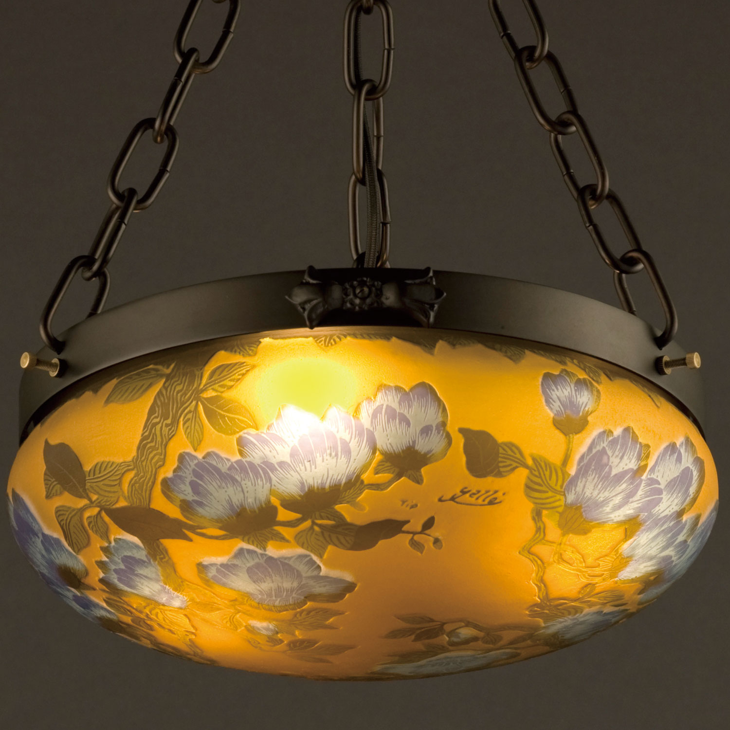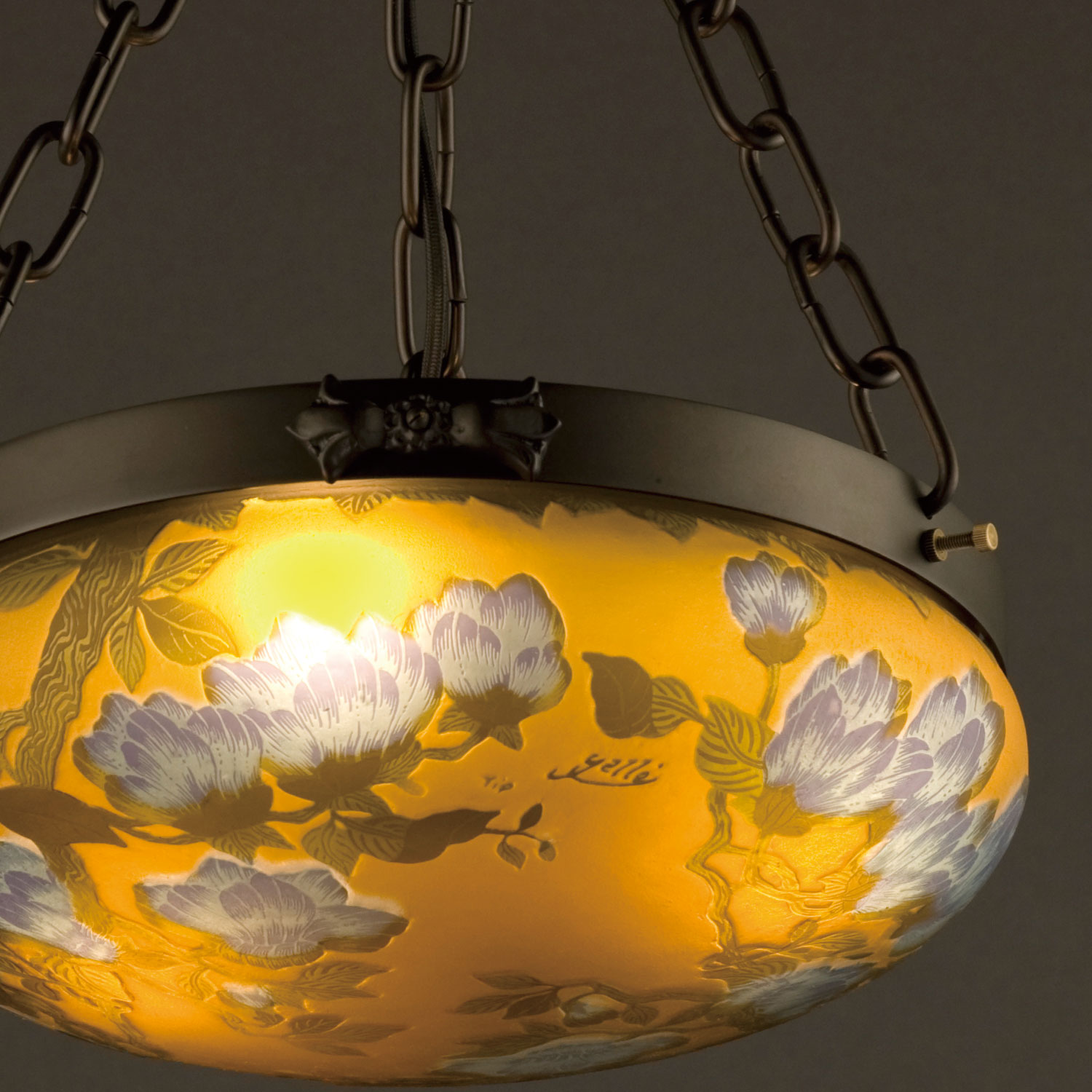 花の様式と謳われた、ヨーロッパ19世紀末の芸術・アールヌーヴォー。ガレコレクションは、繊細な色彩と情緒豊かなモチーフ、そして豊かな工芸技術で時代を彩った、エミール・ガレのガラス工芸品を現代に蘇らせたシリーズです。そのシリーズのちょっと大きめの木蓮柄ペンダントランプです。