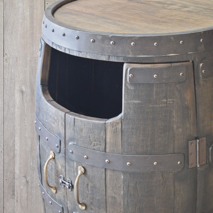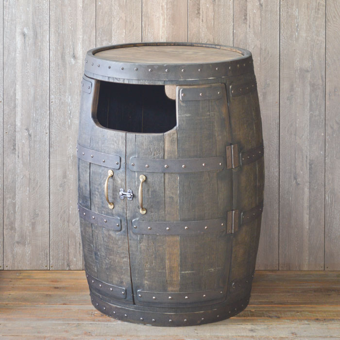 (北海道、九州、沖縄、離島等一部地域を除く) バレルクラフトトラッシュキャビネットは、両開き扉を配し、扉上部と扉の背面部分をくり抜いたウイスキー樽1本まるまるのオープンラックです。