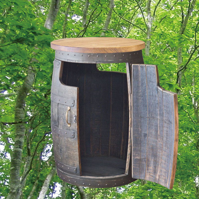 (北海道、九州、沖縄、離島等一部地域を除く) バレルクラフトトラッシュキャビネットテーブルは、両開き扉を配し、扉上部と扉の背面部分をくり抜いたウイスキー樽1本まるまるのテーブルです。