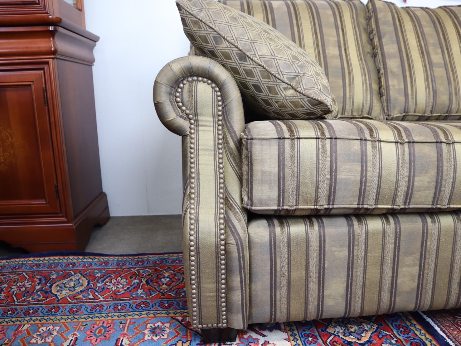 カナダ製の直輸入ソファーです。シートクッションは、ハイグレードウレタンを使用し、シートクッション下のデッキ部分はコイルスプリング構造になっています。織り柄の入った高級なファブリックは、お部屋を選ばず、コーディネートのしやすさも魅力の三人掛けソファーです。