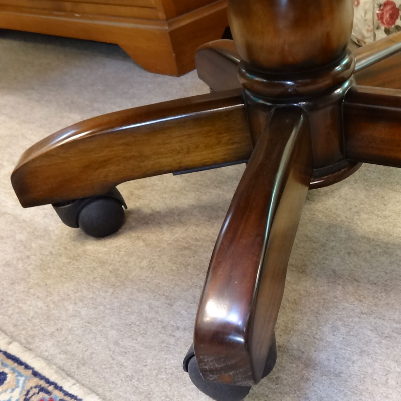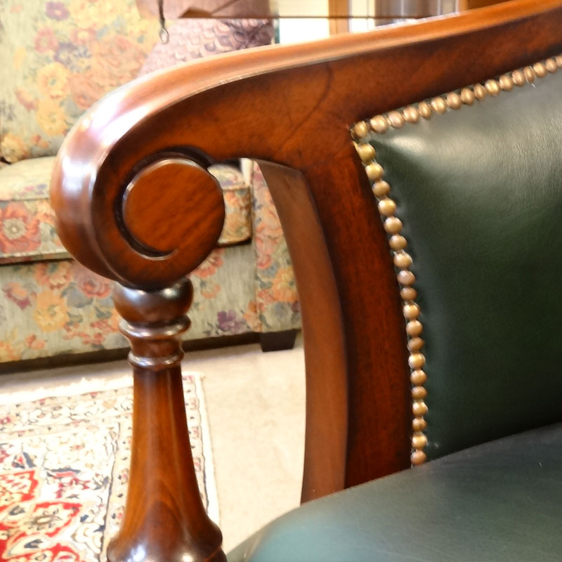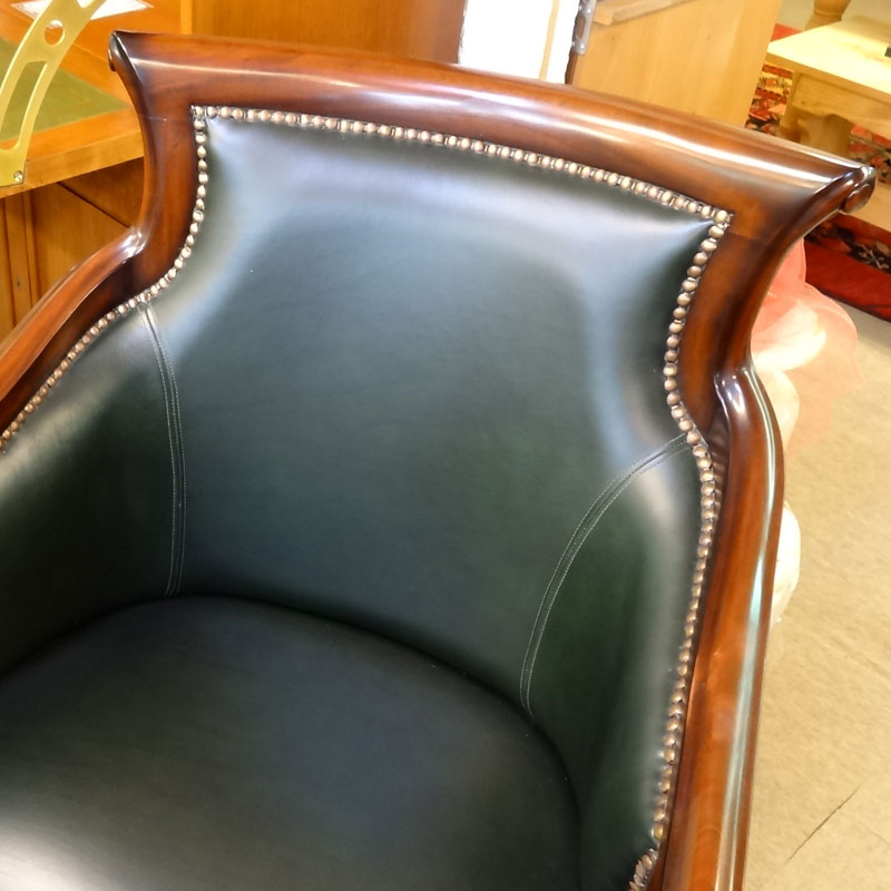 マリナクラシックは、アンテーク加工をし、アンティークの雰囲気を出すため、木部に最初から小さな傷を付けたりしています。(キズを付けて、また、その上から、塗装をしています。)この加工により、マリナクラシックは、重厚感ある伝統的なデザインの味わのある家具へと仕上がるのです。マホガニー材と本革を使って作られた回転椅子 アンティーク調家具【輸入家具】