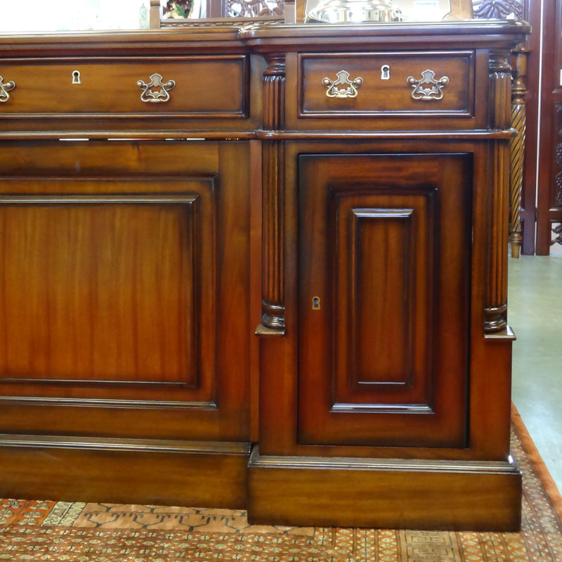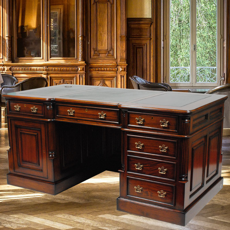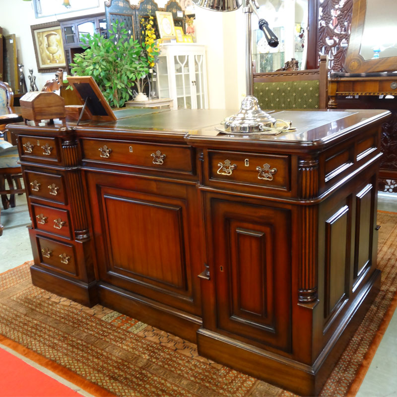 マリナクラシックは、アンテーク加工をし、アンティークの雰囲気を出すため、木部に最初から小さな傷を付けたりしています。(キズを付けて、また、その上から、塗装をしています。)この加工により、マリナクラシックは、重厚感ある伝統的なデザインの味わのある家具へと仕上がるのです。高級材マホガニー材で作られた160cm幅のプレジデントデスク(両袖机) アンティーク調家具【輸入家具