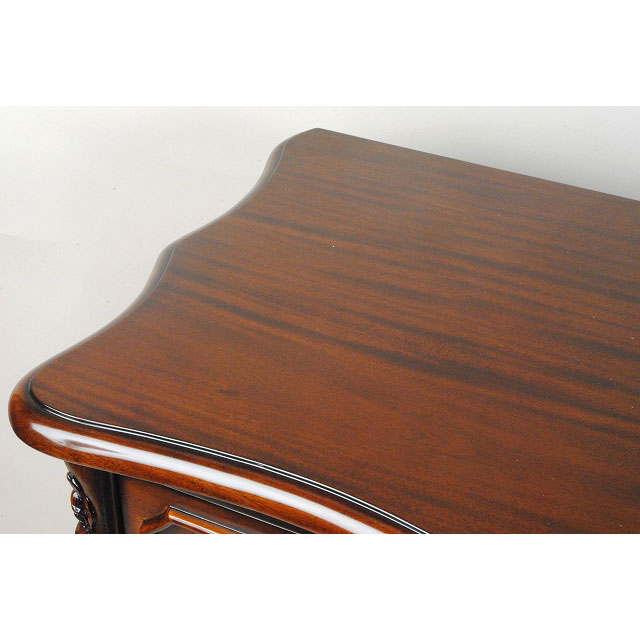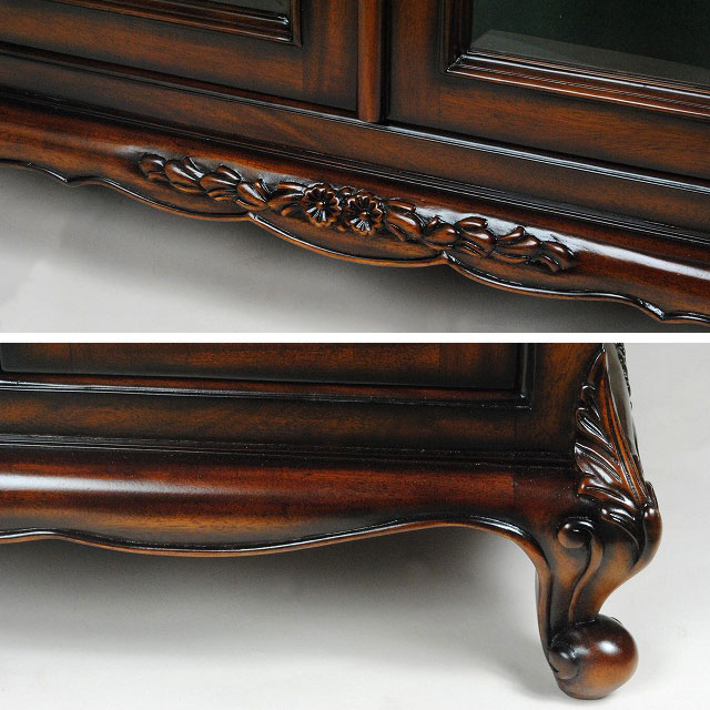 マリナクラシックは、アンテーク加工をし、アンティークの雰囲気を出すため、木部に最初から小さな傷を付けたりしています。(キズを付けて、また、その上から、塗装をしています。)この加工により、マリナクラシックは、重厚感ある伝統的なデザインの味わのある家具へと仕上がるのです。高級マホガニー材で作られた135cm幅のフレンチサイドボード木扉【輸入家具】