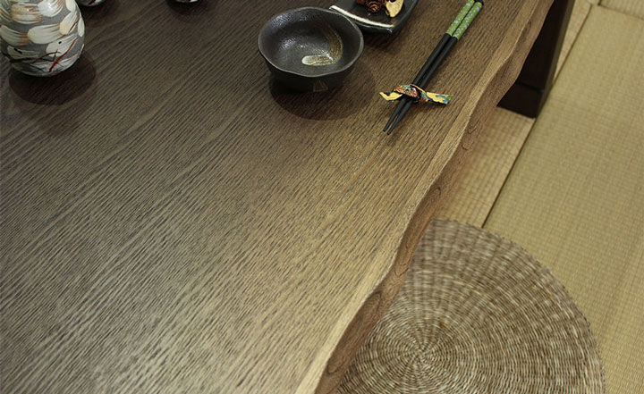 木目を浮き上がらせ年輪の凹凸を強調し、木の素材感を高める技法。